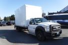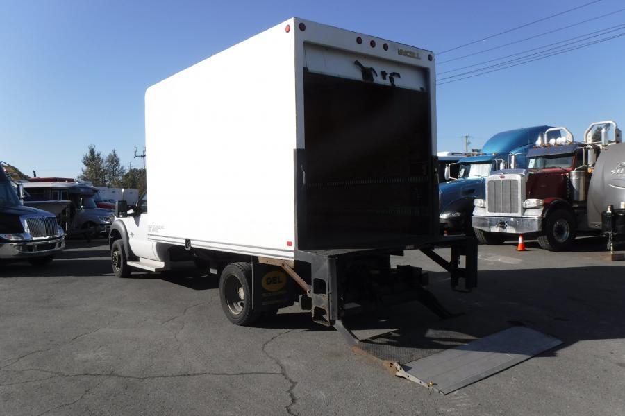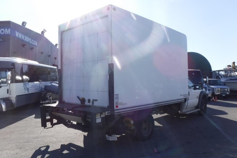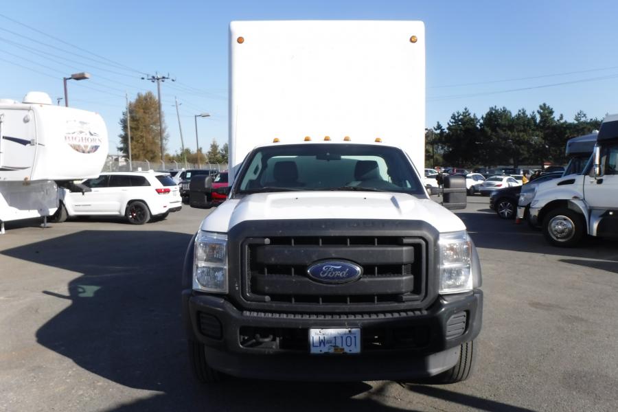 2013 Ford F-550 Regular Cab 14 Foot High Roof Cube Van Dually Diesel 2WD with Power Tailgate, 6.7L V8 OHV 16V DIESEL engine, 8 cylinder, 2 door, automatic, Wheelbase 17 feet (204 inches) RWD, air conditioning, AM/FM radio, white exterior, grey interior, vinyl. box dimensions 14 feet long, 7.5 feet wide, 8 feet high.