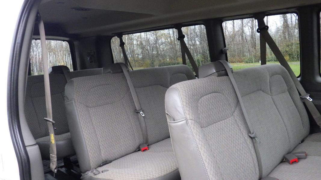 2017 Chevrolet Express 3500 Extended 11 Passenger Van 4WD, (10 passengers plus driver = 11 passengers total), extra room for another 4 seater bench to increase capacity to 15 passengers, 6.0L V8 OHV 16V FFV engine, 8 cylinders, 2 door, automatic, 4WD, 4-Wheel ABS, cruise control, automatic headlights, power mirrors, power locks, manual mode, tow/haul mode, traction control, dual zoned climate control, 120V AC outlet, rubber floor mats, 180 degree rear doors, aluminum side step, air conditioning, AM/FM radio, power windows, power mirrors, white exterior, grey interior, cloth. The certification decal is valid until September 2024.