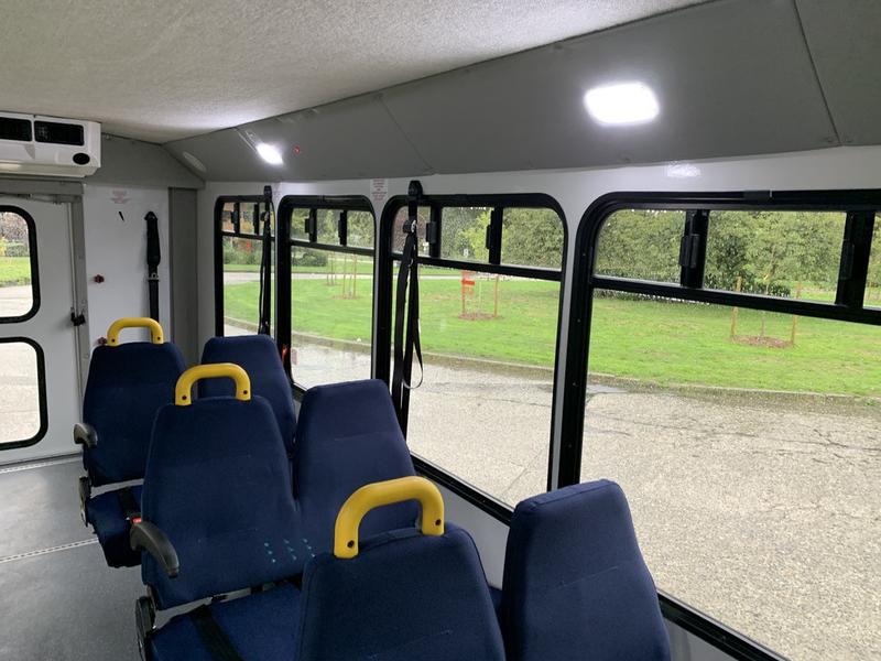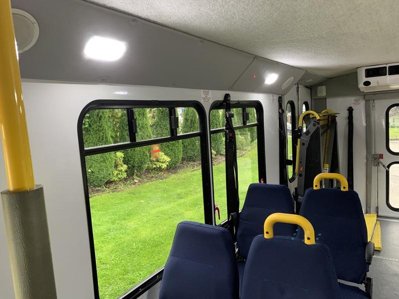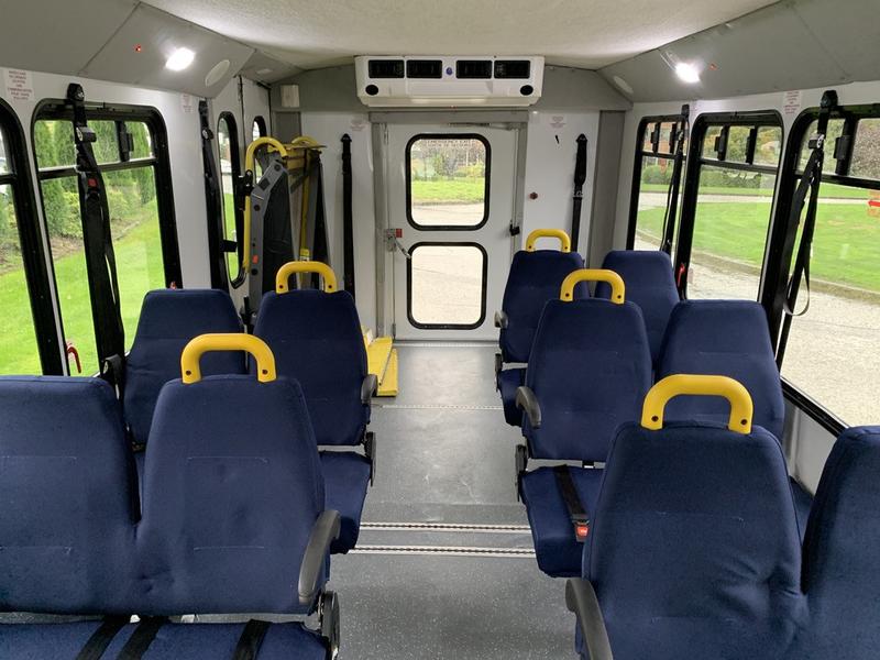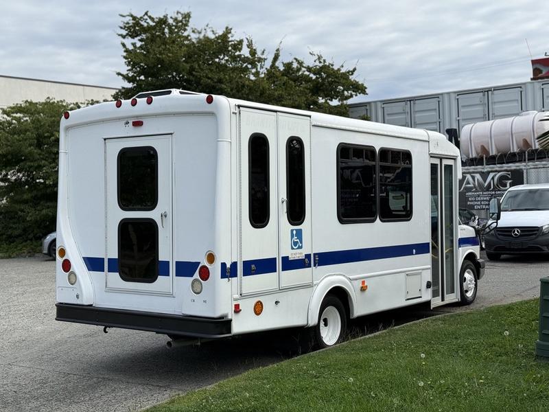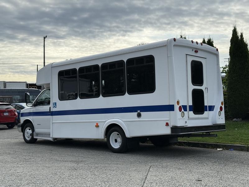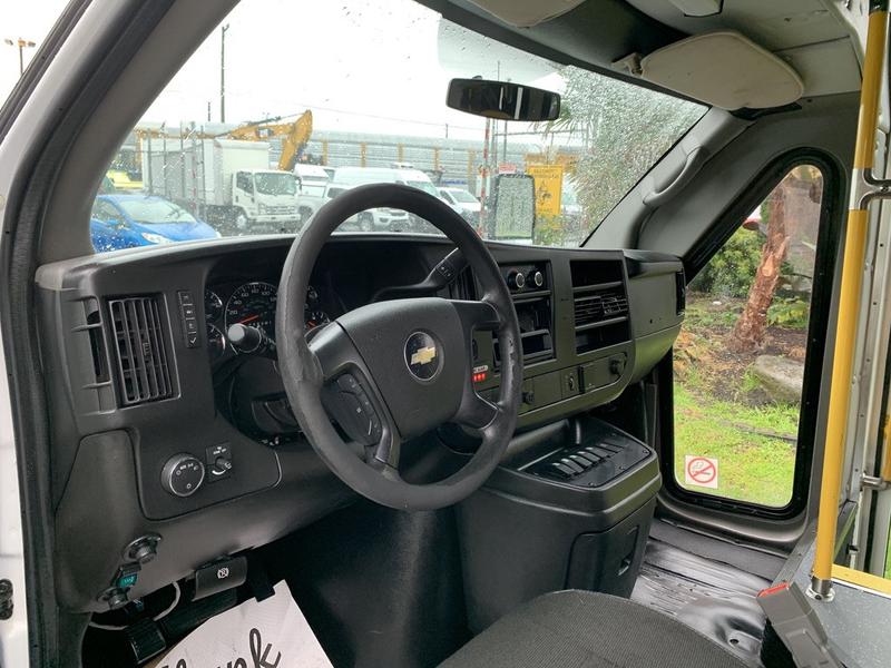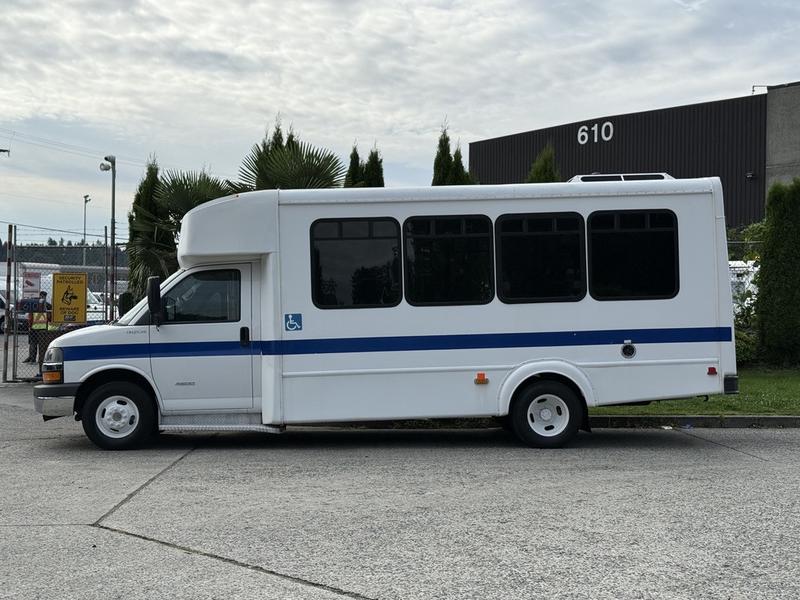2015 Chevrolet Express G4500 11 Passenger Wheelchair Accessible Shuttle Bus, 6.0L, 8 cylinder, 2 door, automatic, RWD, cruise control, AM/FM radio, power door locks, white exterior, blue interior.