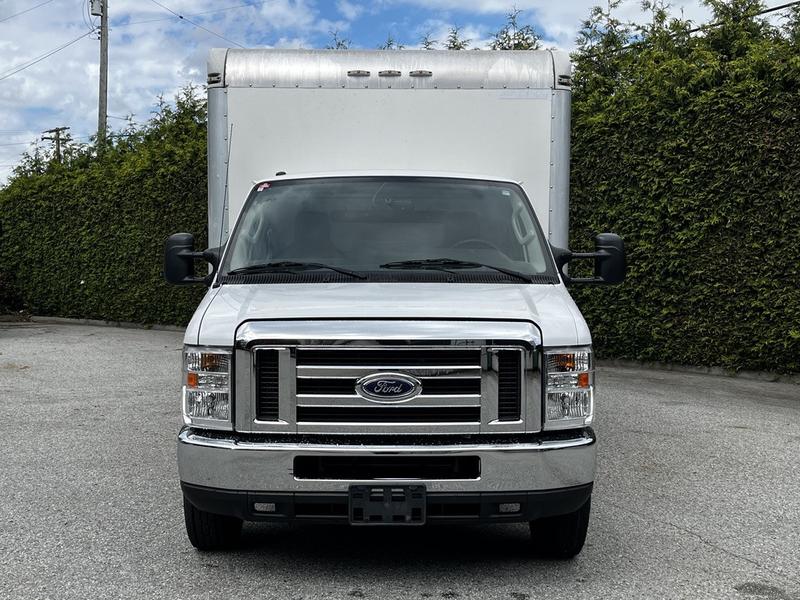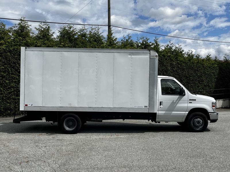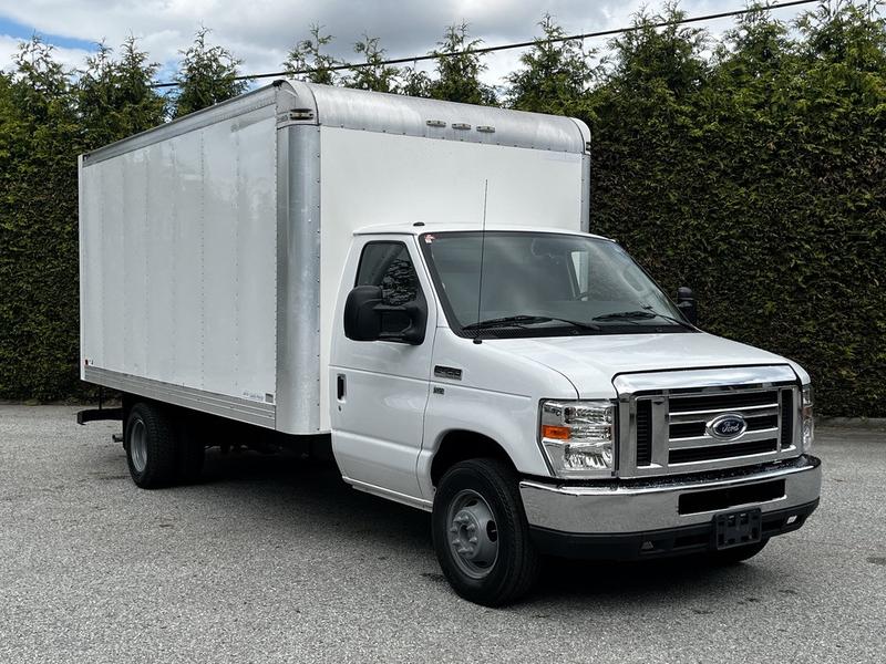 2018 Ford Econoline E-450 16-Foot Cube Van Box Truck, 6.2L, 8 cylinder, 2 door, automatic, RWD, cruise control, air conditioning, AM/FM radio, CD player, white exterior, grey interior, cloth. Box dimensions: 16FT L, 6FT 8" H, 7FT 8" W. British Columbia Commercial Vehicle Inspection is currently valid through April 2026.