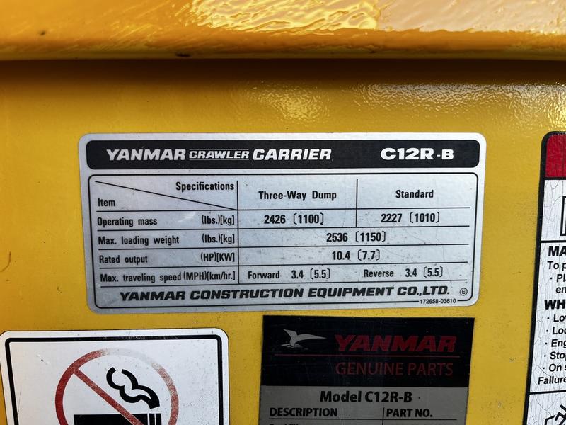 2013 Yanmar C12R-B Tracked Dump Diesel, 0.5L, 2 cylinder, automatic, Track, yellow exterior, black interior. Operating weight: 1100 kg, payload: 1150 kg, track width: 230 mm, max traveling speed: 3.4 mph (5.5 km/h), dumping angle: 56° / 58°, dumping vessel capacity: 0.4 / 0.52 m³, dump clearance: 325 mm.