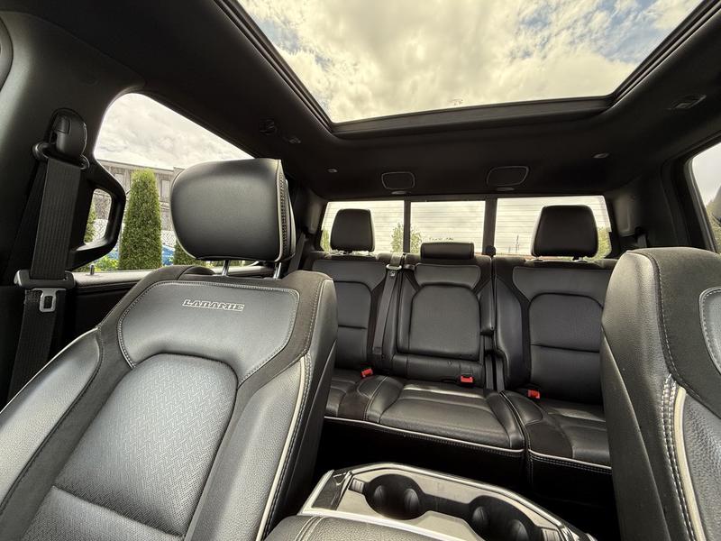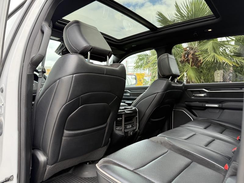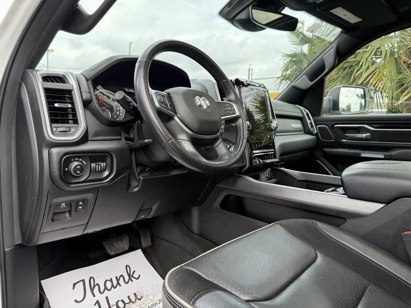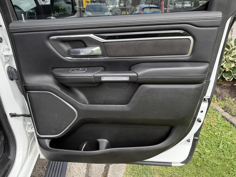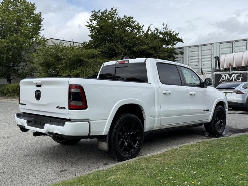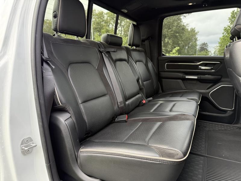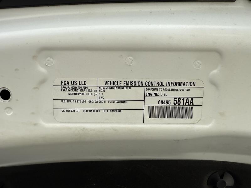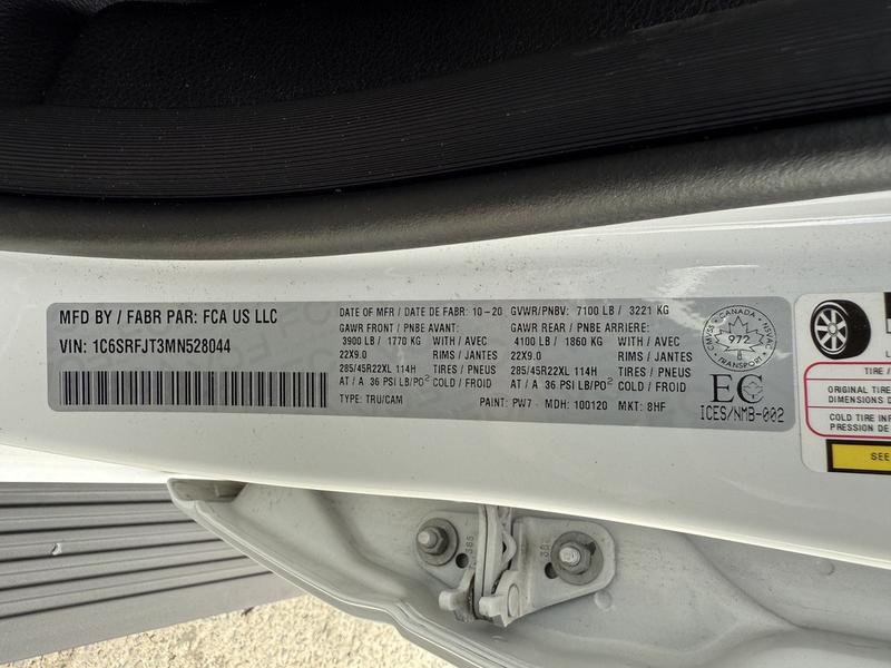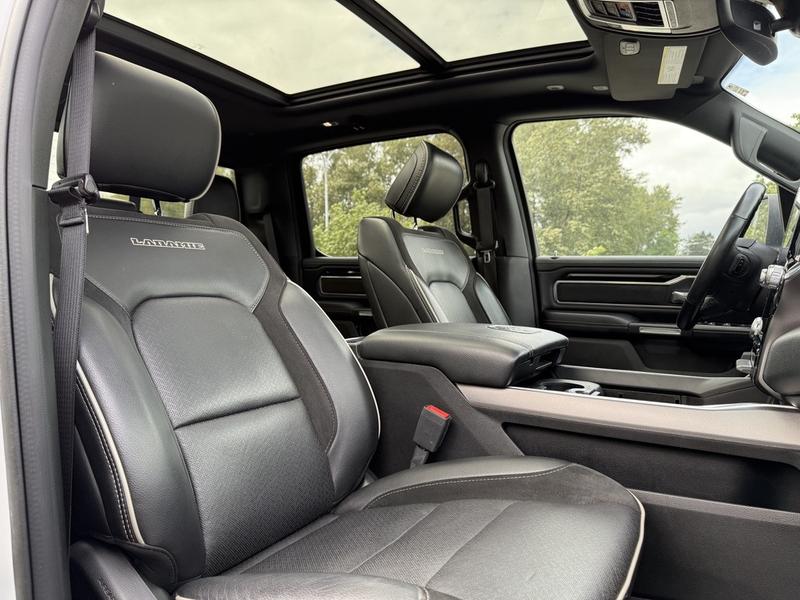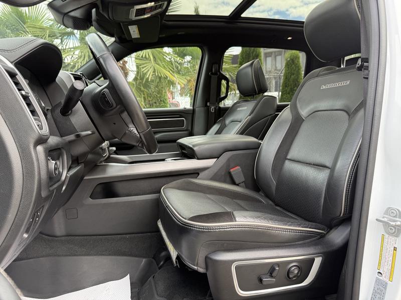 2021 RAM 1500 Laramie Crew Cab Short Box 4WD, 5.7L, 8 cylinder, 4 door, automatic, 4WD, 4-Wheel ABS, cruise control, air conditioning, AM/FM radio, power door locks, power windows, power mirrors, power sunroof, white exterior, black interior, leather. Bluetooth, power adjustable foot pedals, auto start/stop, backup camera, front heated seats, front ventilated seats, rear heated seats, front power seats, driver’s memory seat, heated steering wheel, trailer brake controller, tow/haul mode, parking sensors, power moonroof, trailer hitch receiver, tonneau cover, wireless charger.