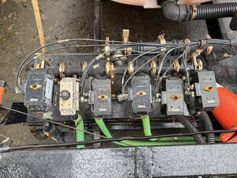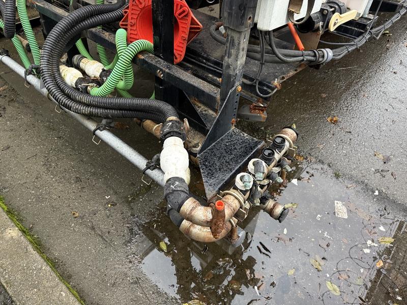 Hook-lift mounted liquid brine sprayer system with approx. 1250 US gallon capacity. Designed for anti-icing and de-icing applications. Year, make and model are unknown.