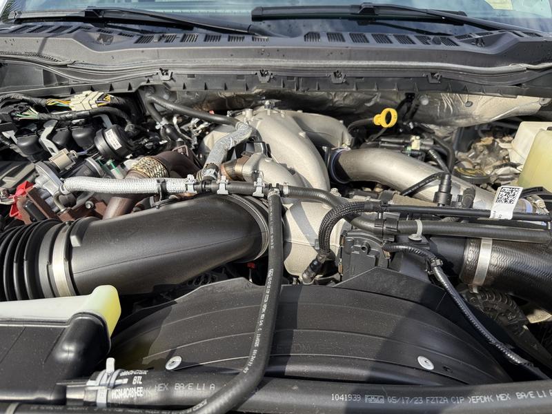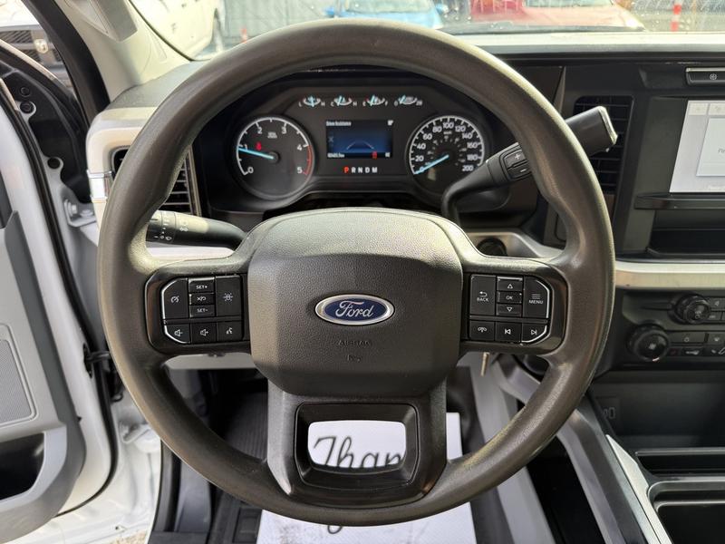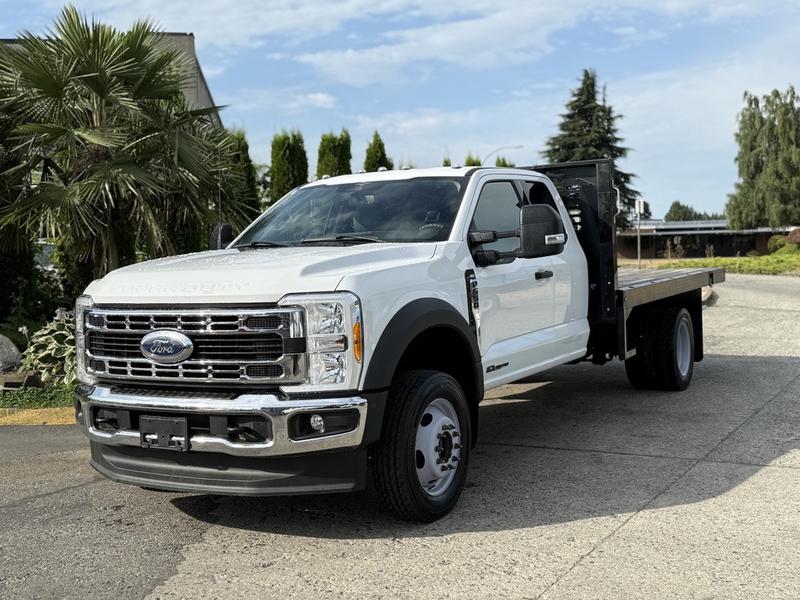 2023 Ford F-550 XLT SuperCab 12-Foot Flat Deck Truck 4x4 Diesel, 6.7L, 8 cylinder, 4 door, automatic, 4WD, cruise control, air conditioning, AM/FM radio, power door locks, power windows, power mirrors, white exterior, grey interior, cloth. 12' x 8' deck, Bluetooth, exhaust brake, power seats, heated seats, 4x4 selector, trailer package, power pedal adjustment, electronic parking brake, AUX switches. Certification and decal valid until October 2025.