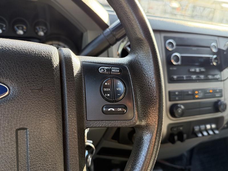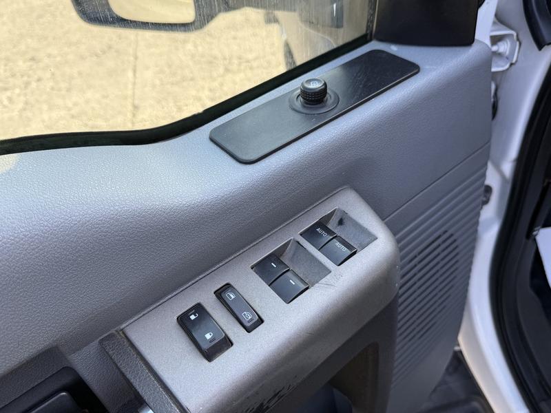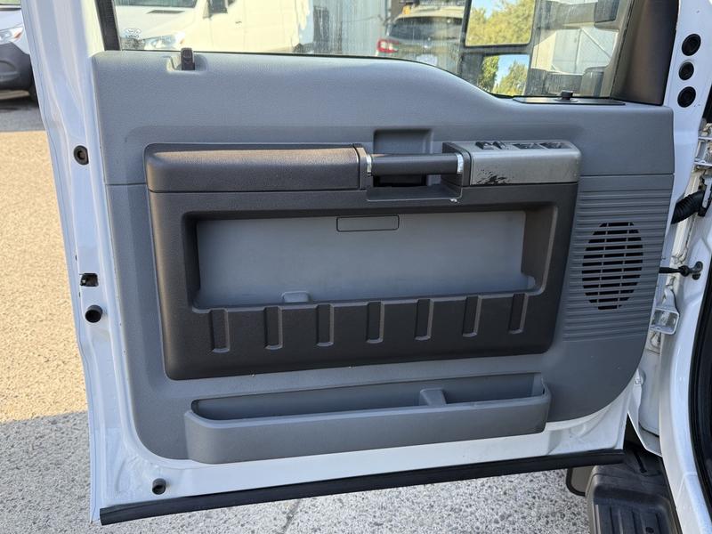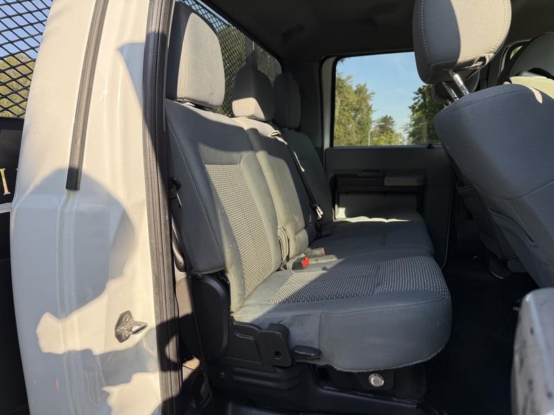 2014 Ford F-550 Super Duty 4x4 Crew Cab 11-Foot Flat Deck Truck, 6.8L, 10 cylinder, 4 door, automatic, 4WD, cruise control, air conditioning, AM/FM radio, power door locks, power windows, power mirrors, white exterior, grey cloth interior. The flat deck measures 11 feet 4 inches long by 7 feet 10 inches wide. Overall vehicle dimensions are approximately 24 feet 6 inches long, 8 feet 2 inches wide, and 7 feet 4 inches high.