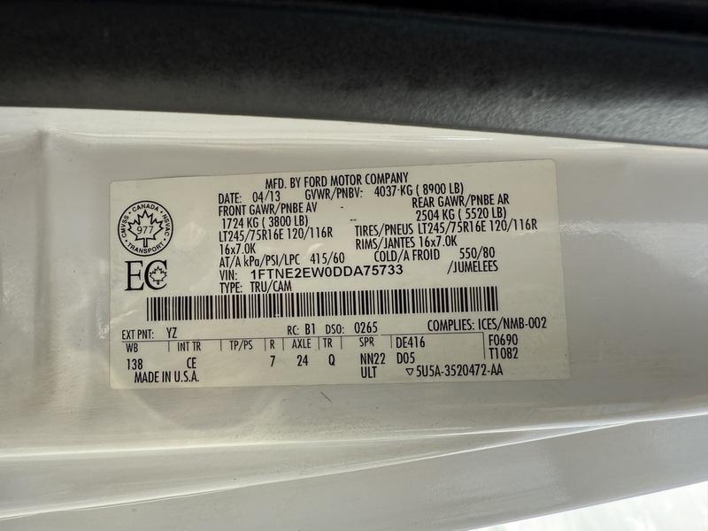 2013 Ford Econoline E-250 SuperDuty Cargo Van, 4.6L, 8 cylinder, 2 door, automatic, RWD, 4-Wheel ABS, cruise control, air conditioning, AM/FM radio, power door locks, power windows, power mirrors, white exterior, grey interior, cloth. GVWR 4,037 KG / 8,900 LBS.