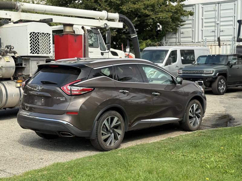 2016 Nissan Murano Platinum AWD, 3.5L, 6 cylinder, 4 door, automatic, 4WD, 4-Wheel ABS, cruise control, air conditioning, AM/FM radio, power door locks, power windows, power mirrors, brown exterior, beige interior, leather. Backup camera, Bluetooth, navigation, heated steering wheel, power trunk, power folding seats, power seats, heated seats. Overall vehicle measurements: 192" L x 74" W x 66" H.