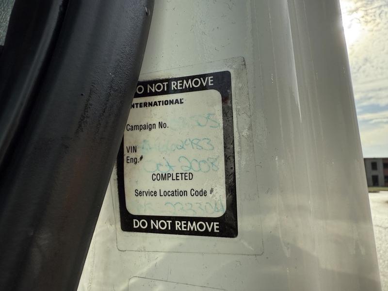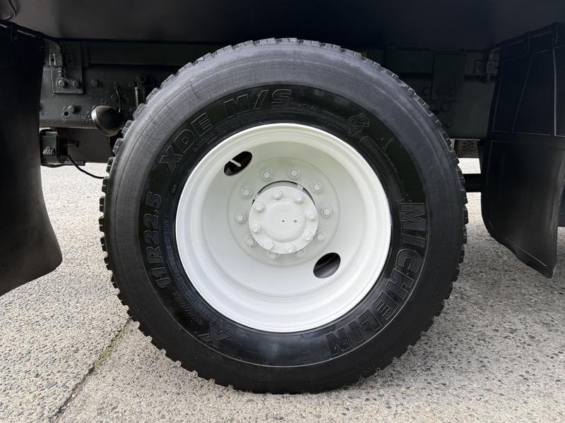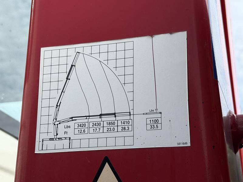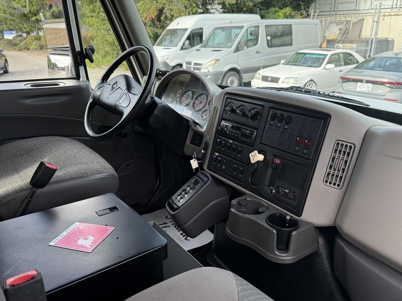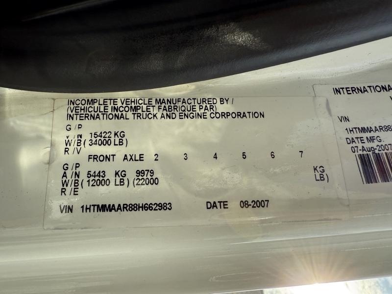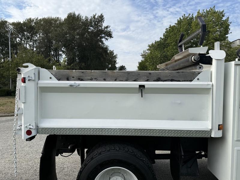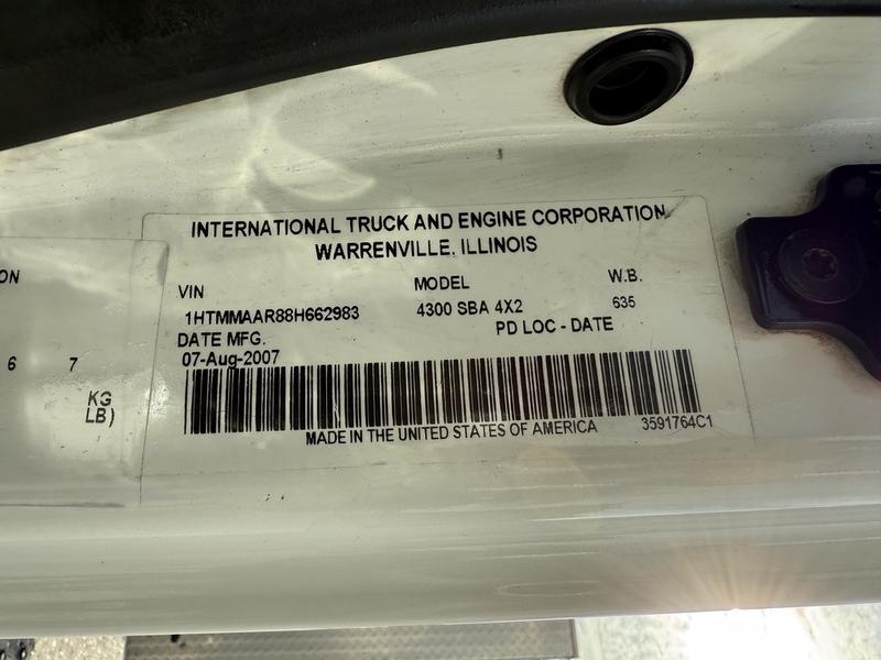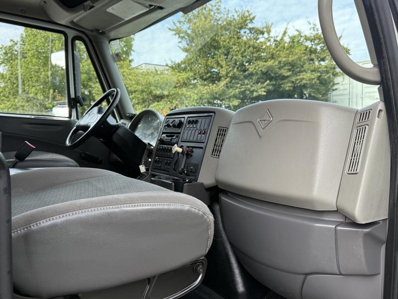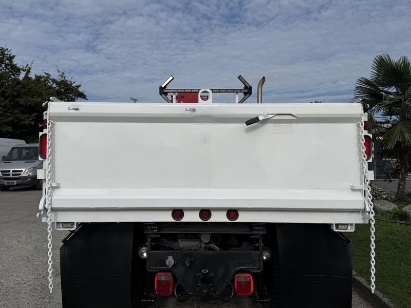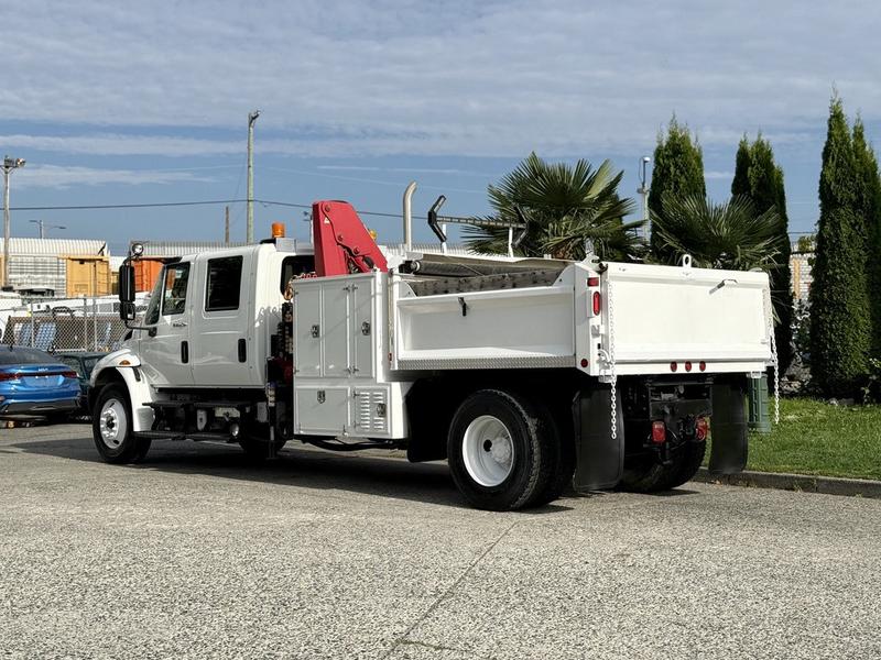 2008 International 4300 Diesel with Amco Veba Crane and 8-Foot Dump Box, 7.6L, 6 cylinder, automatic, 4X2, white exterior, grey interior, cloth. Equipped with air brakes. Inside dump measurements: 8'1" L x 7'7" W x 2'3" H with a 450 lb dump capacity. Overall vehicle measurements: 28'6" L x 8'7" W x 11' H. GVWR 15,422 kg / 34,000 lbs. Certification and decal valid until September 2026.