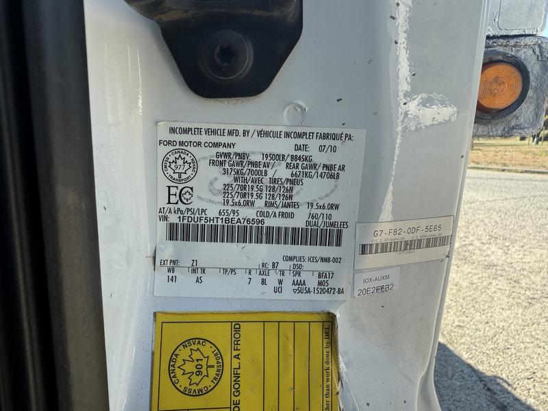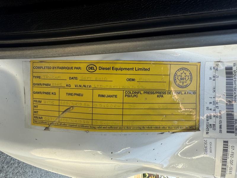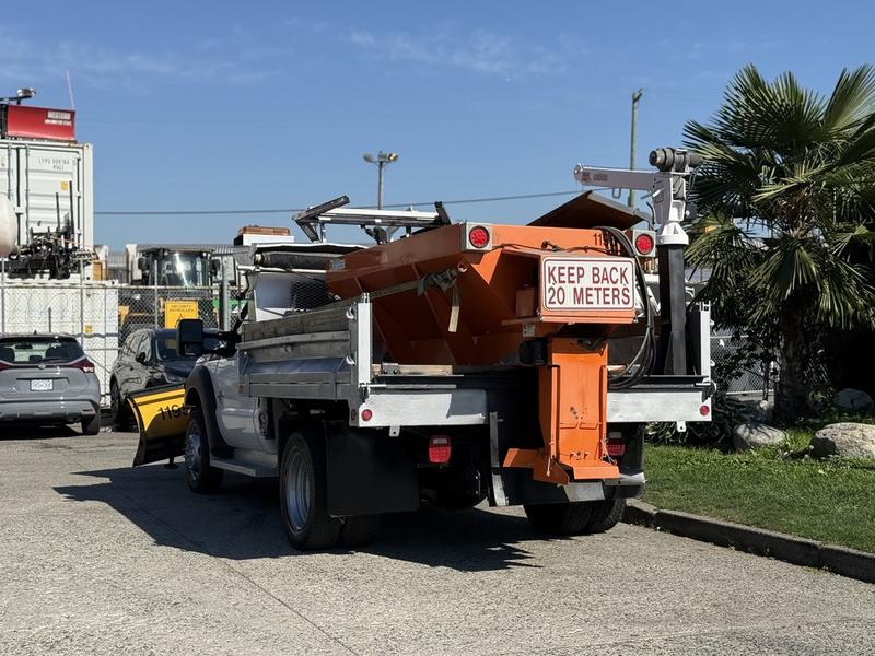 2011 Ford F-550 Regular Cab Dually 4X4 Diesel Dump Plow Truck with Crane & Sander, 6.7L, 8 cylinder, 2 door, automatic, 4WD, air conditioning, AM/FM radio, white exterior, grey interior, vinyl. Equipped with a Meyer Lot Pro plow, Henderson sander, and Ideal L2000 crane (last inspected July 19, 2024). Dump box measures 9 feet long by 7 feet 6 inches wide. Plow measures 9 feet wide by 2 feet 4 inches high. Overall vehicle dimensions are 23 feet 8 inches long, 9 feet wide, and 9 feet 1 inch high. GVWR is 8,845 kg (19,500 lbs). Certification and decal valid until September 2026.