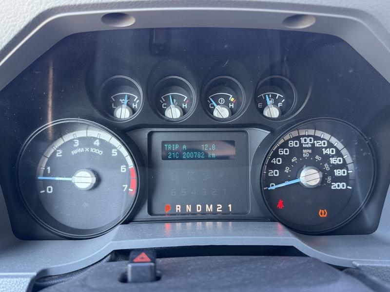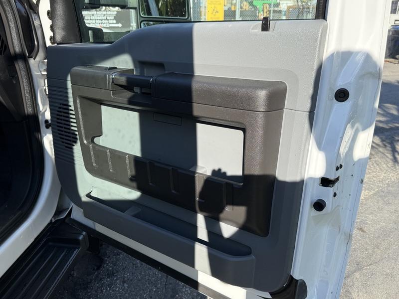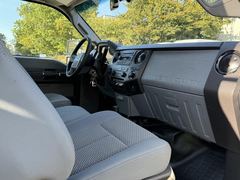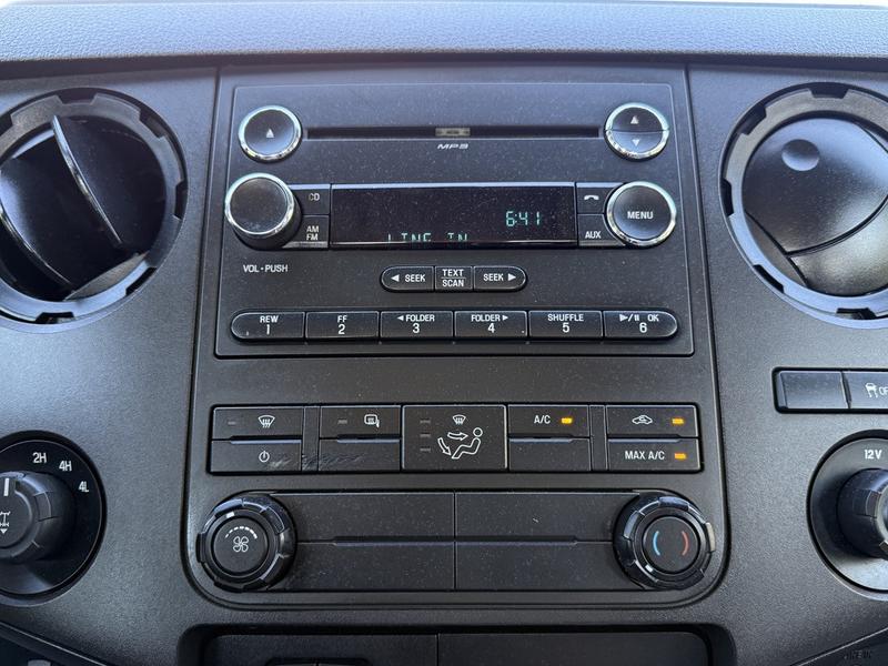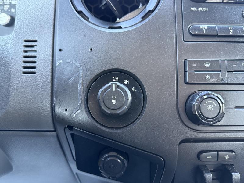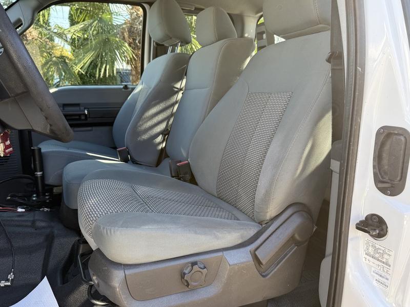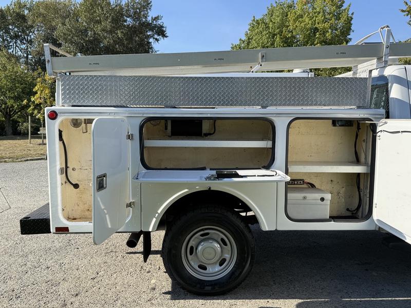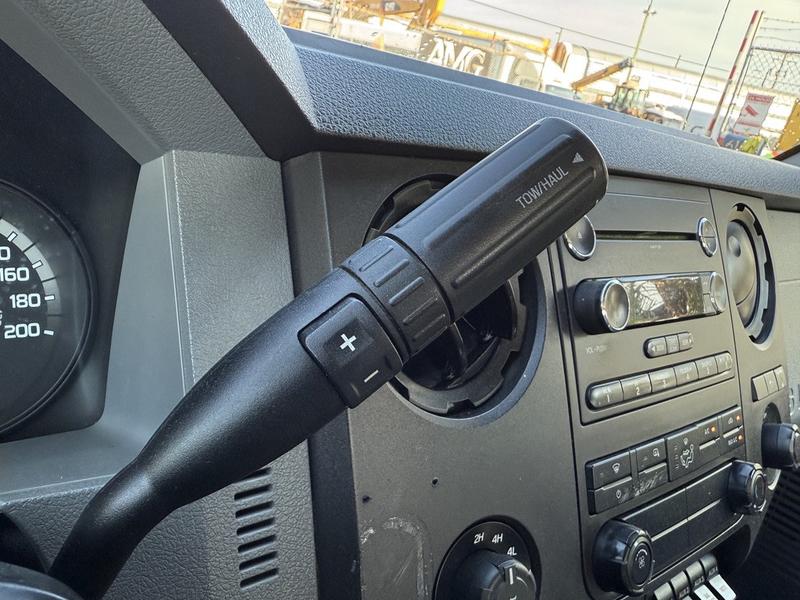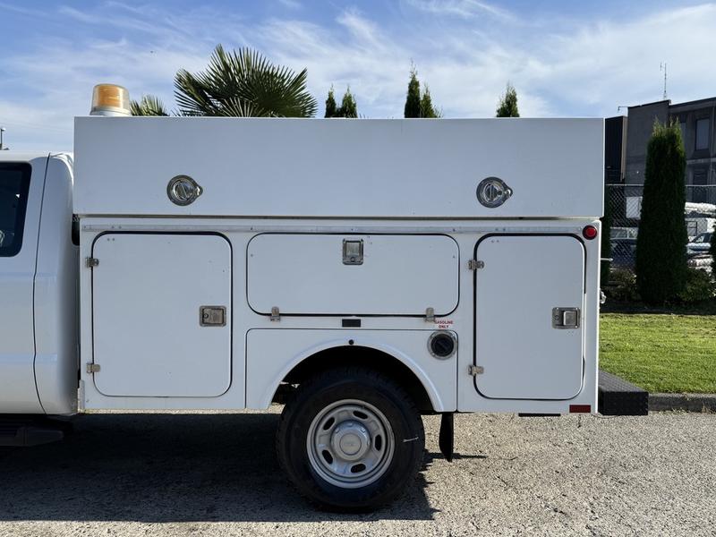 2012 Ford F-350 SD XL SuperCab 4WD Service Truck, 6.2L, 8 cylinder, 4 door, automatic, 4WD, 4-Wheel ABS, cruise control, air conditioning, AM/FM radio, CD player, power door locks, power windows, power mirrors, white exterior, grey cloth interior. Equipped with 4X4 gear selector, differential lock, radio, and heating/air conditioning. Overall vehicle dimensions are 23 feet long, 6 feet 8 inches wide, and 7 feet 6 inches high.