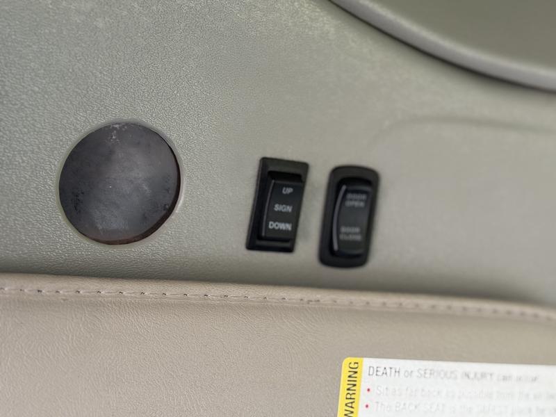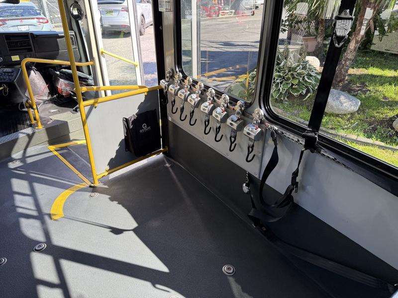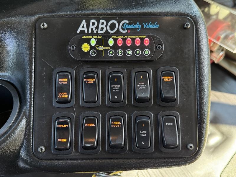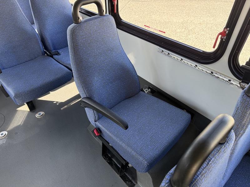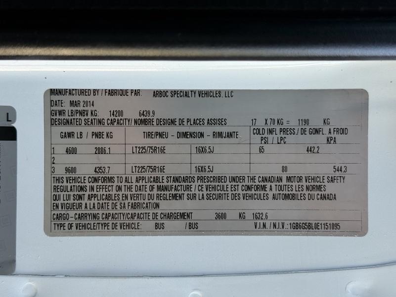 2014 Chevrolet Express G4500 19-Passenger Wheelchair Accessible Kneeling Bus with Duramax Diesel, 6.0L V8 engine, automatic transmission, and rear-wheel drive. This versatile shuttle features a kneeling suspension system that lowers the vehicle for easier boarding, along with a wheelchair ramp for accessible transportation. The bus seats 19 passengers including the driver and comes equipped with a ThermoKing rear air conditioning and heating system, cruise control, an automatic adjustable driver seat, and a body master switch. Finished in white with a blue vinyl interior, this bus is well-suited for senior care facilities, shuttle services, or mobility transport. GVWR is 6,439 kg (14,200 lbs), and overall vehicle dimensions are 26 feet 9 inches long, 8 feet 4 inches wide, and 9 feet 1 inch high. Certification and decal are valid until March 2026.