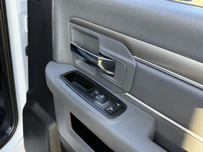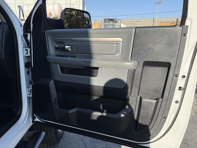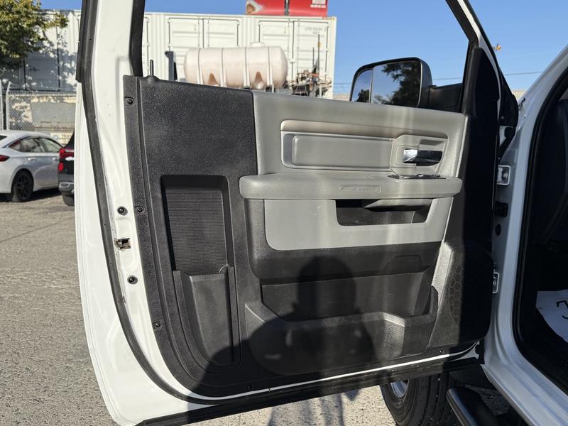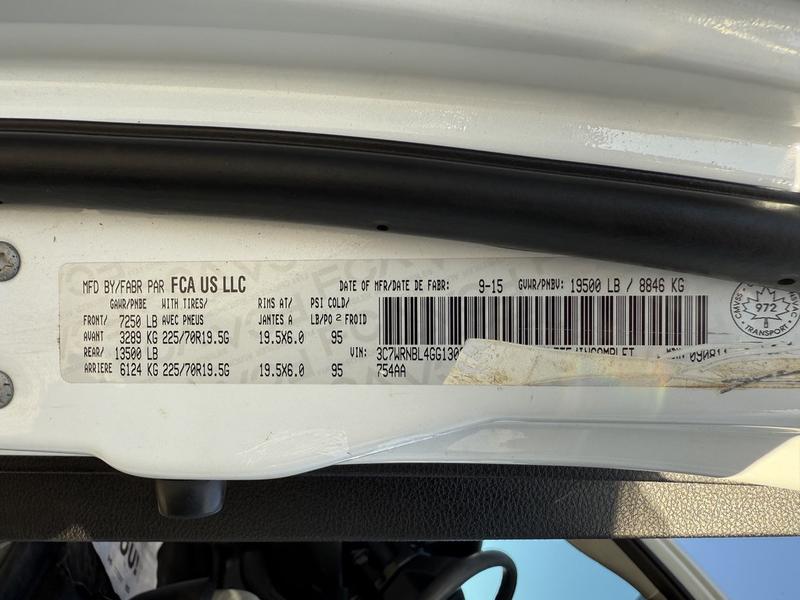 2016 RAM 5500 Regular Cab 4X4 Dually 12-Foot Cube Van, powered by a 6.7L Cummins Turbo Diesel 6-cylinder engine with automatic transmission and four-wheel drive. This commercial work van features a 12-foot box equipped with interior shelving, making it ideal for contractors, delivery services, or mobile technicians. It includes a 4X4 gear selector, tow package, AM/FM radio, air conditioning and heat, power windows, power door locks, and power mirrors. Finished in white with a grey interior. Overall vehicle dimensions are approximately 24 feet 2 inches long, 7 feet 9 inches wide, and 10 feet 11 inches high. GVWR is 8,846 kg (19,500 lbs).