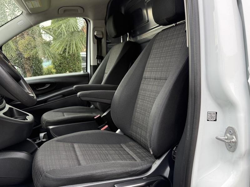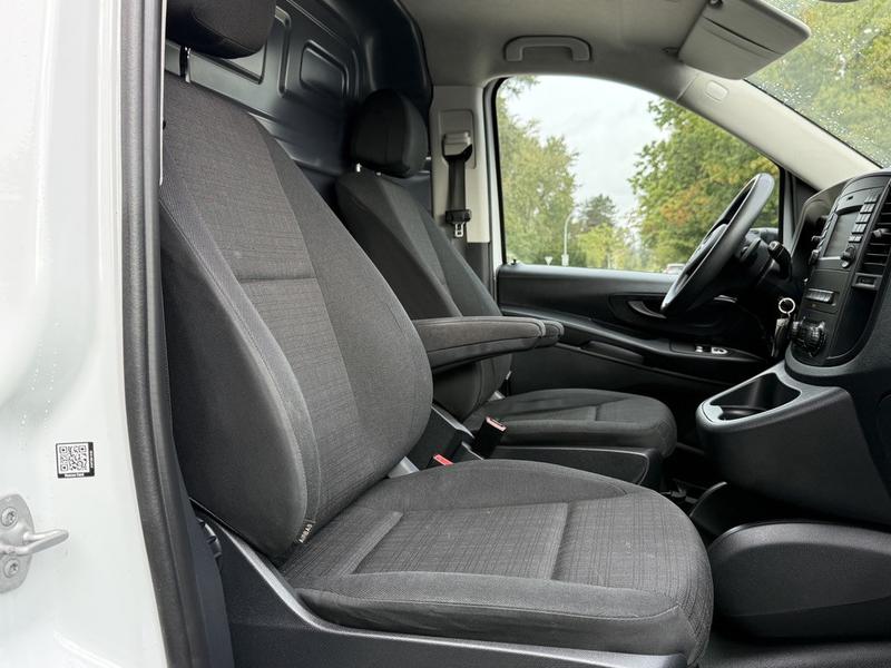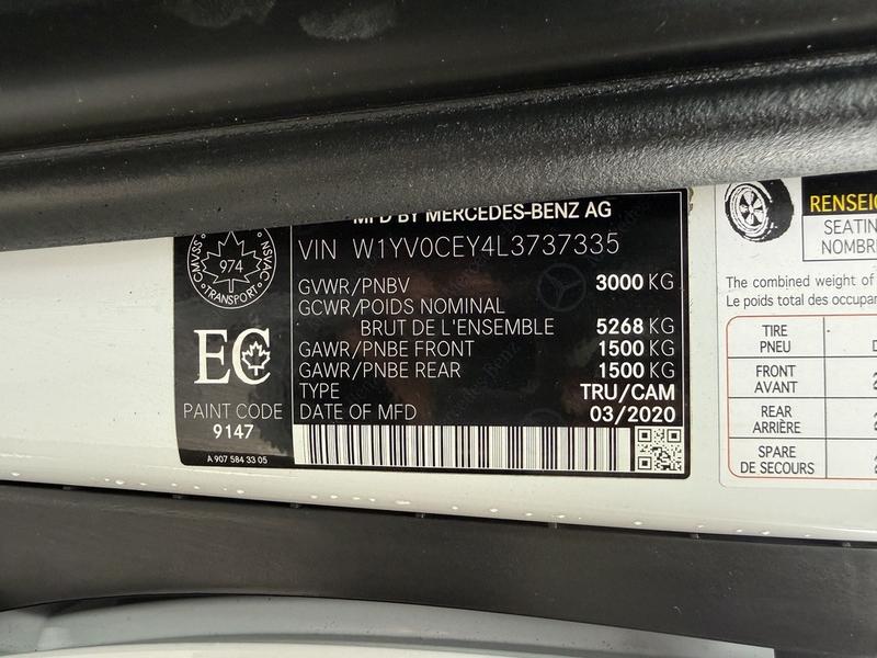 2020 Mercedes-Benz Metris Cargo Van, powered by a 2.0L engine with automatic transmission and rear-wheel drive. This compact commercial van is ideal for tradespeople and urban deliveries, offering a well-equipped interior with backup camera, Bluetooth, paddle shifters, AM/FM radio, and air conditioning with heat. Additional convenience features include cruise control, electronic parking brake, auto start-stop, cup holders, automatic headlights, and power options for door locks, windows, and mirrors. The GVWR is rated at 3,000 kg. Finished in white with a black cloth interior, the Metris combines practicality and comfort in a versatile cargo platform.