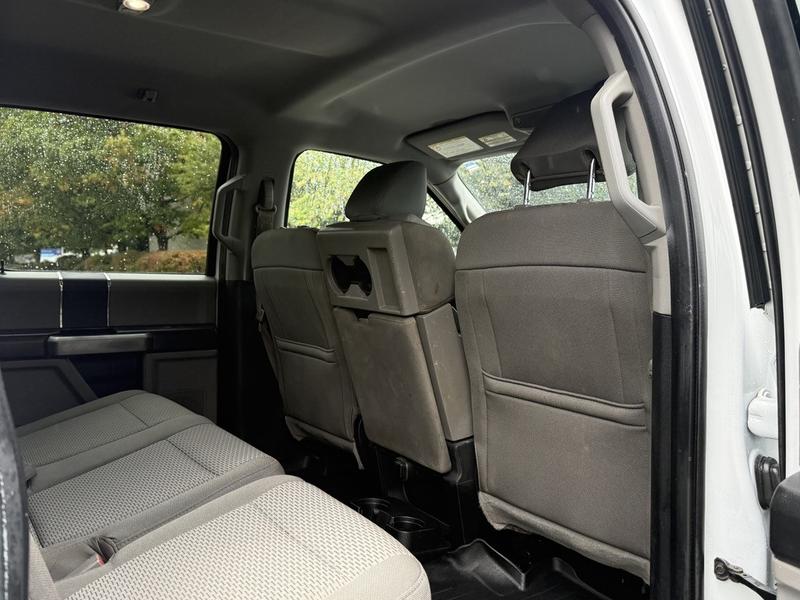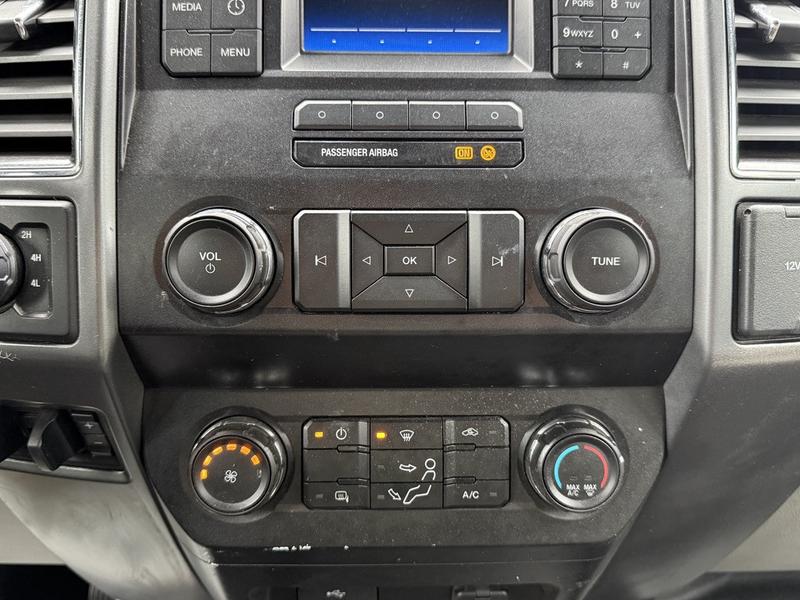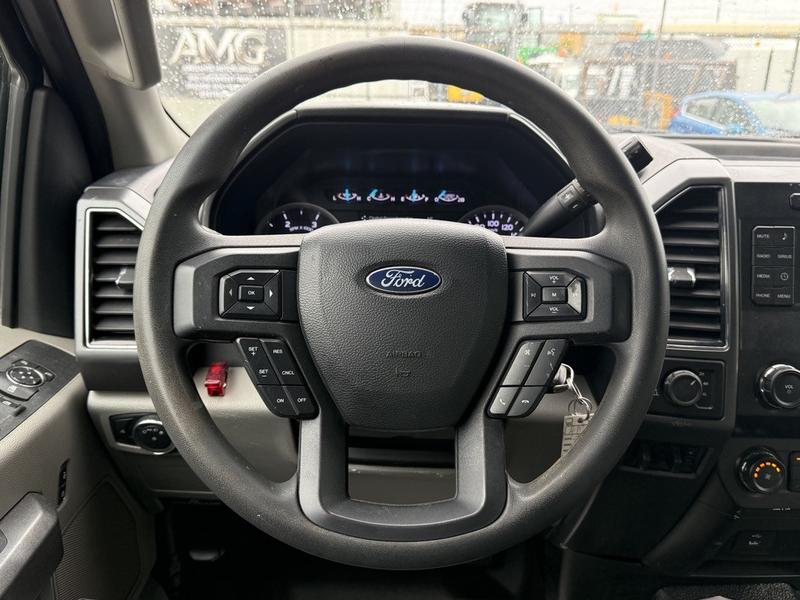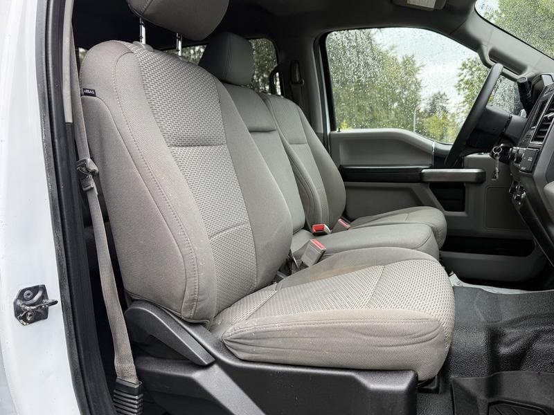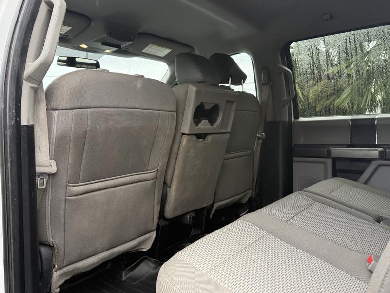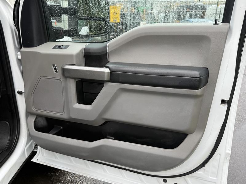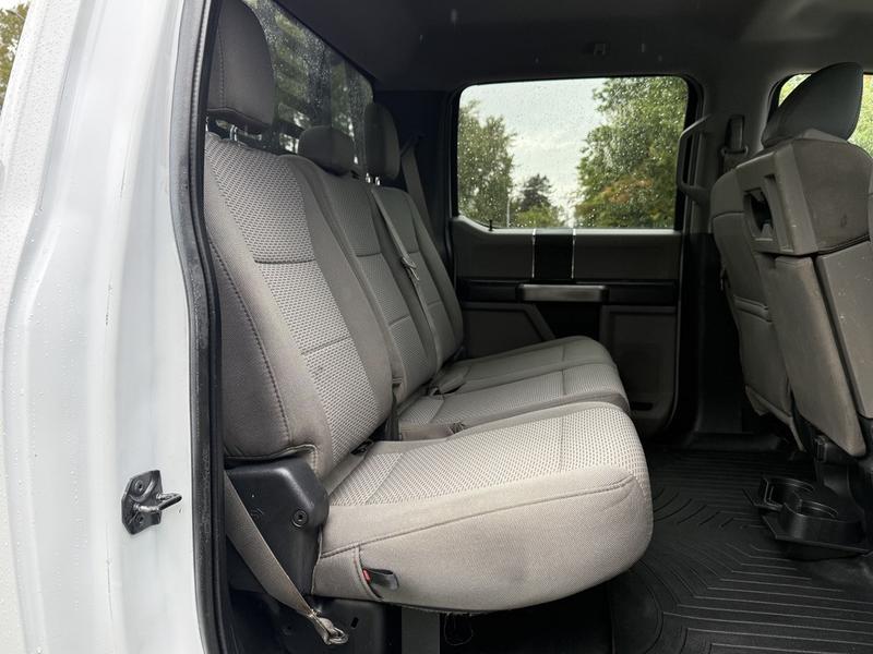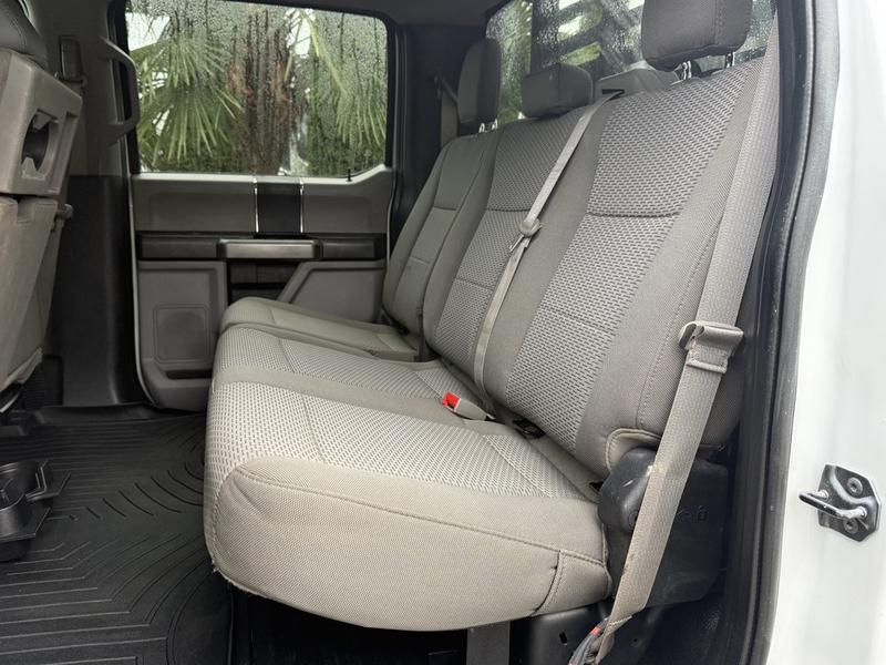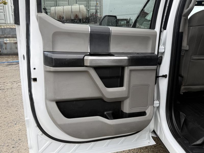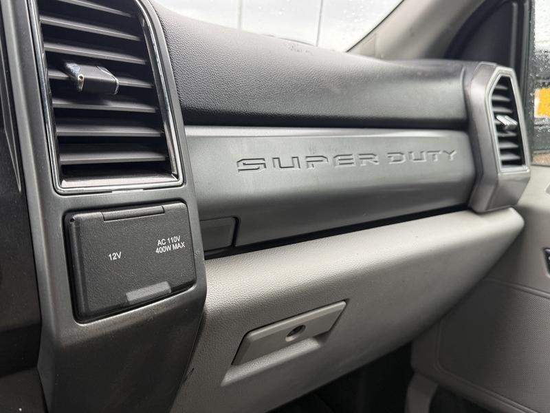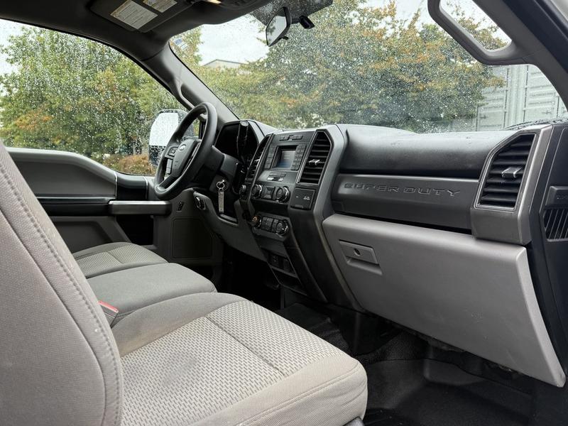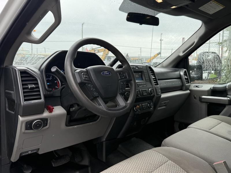 2019 Ford F-350 Super Duty XLT Crew Cab 4x4 with 8-foot flat deck, powered by a 6.7L Power Stroke diesel engine paired with an automatic transmission and four-wheel drive. This full-size work truck features an 8-foot 5-inch long by 7-foot 6-inch wide flat deck—ideal for hauling tools, equipment, or materials. The truck includes air conditioning, cruise control, power group features (locks, windows, mirrors), 4-wheel ABS, and an AM/FM radio. Finished in white with a grey cloth interior, it offers comfort for work crews and versatility for job sites. Overall dimensions are 22 feet 3 inches long, 7 feet 11 inches wide, and 7 feet 4 inches high.