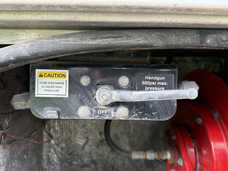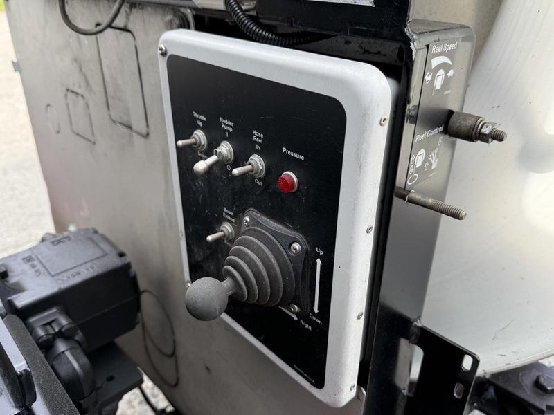 2014 International 7500 Vactor 2100 Series Vacuum Truck, powered by a 9.3L 6-cylinder diesel engine, automatic transmission, and 6x4 drivetrain. Outfitted with a Vactor 2100 Series vacuum system powered by a John Deere auxiliary engine (APU). Features include a water blast diagnostic panel, handgun pressure wand, Vactor thermoplastic components, rear signal arrow board, and multiple switch controls (strobe, off-road, fan overboard, master, and diff lock). Also includes storage compartments, cruise control, air brakes, AM/FM radio, and a grey cloth interior. GVWR rated at 26,308 KG (58,000 LB). Overall dimensions: 37'7" long × 8'9" wide × 11'2" high.