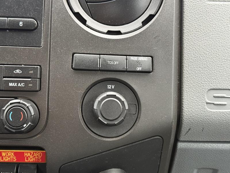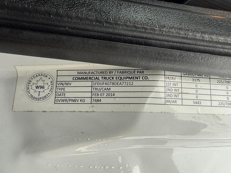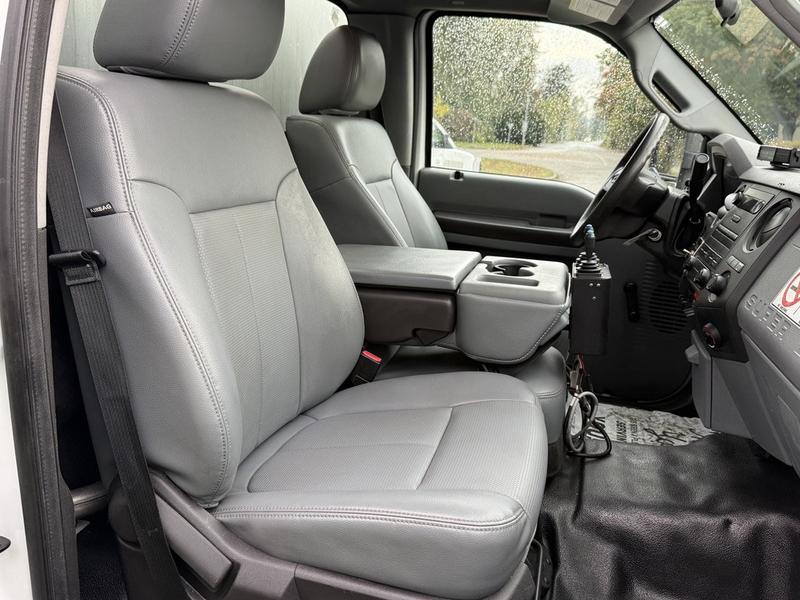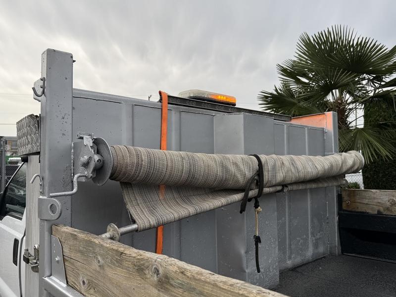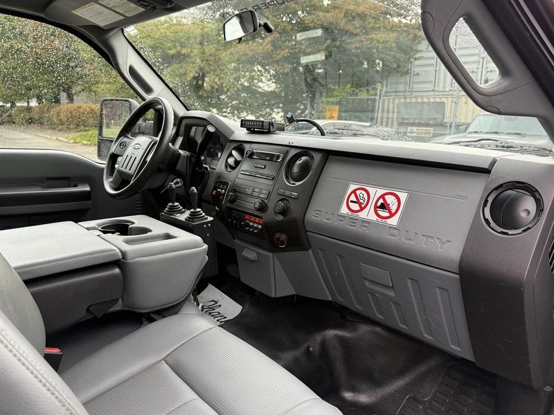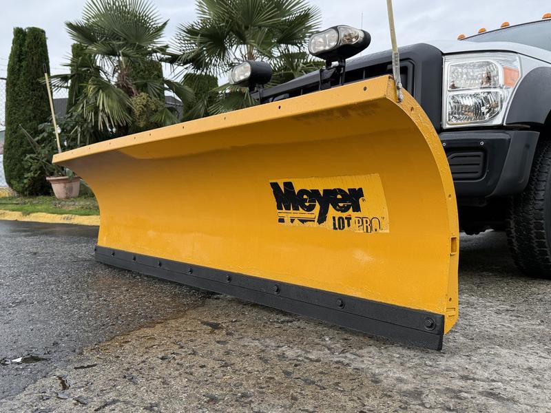 2013 Ford F-450 SD regular cab dually plow truck with 9-foot dump box, powered by a 6.7L diesel engine with rear-wheel drive and automatic transmission. Equipped with PTO, trailer brake, beacon, work light, plow light, hazard light, and hoist switches, as well as a lockable tailgate switch and Webasto heater control. Features an AM/FM radio, 12V input, and storage compartments. Includes a Meyer front plow and dump awning. White exterior over grey vinyl interior. Built for heavy-duty snow and hauling tasks.