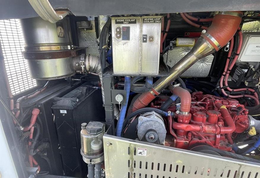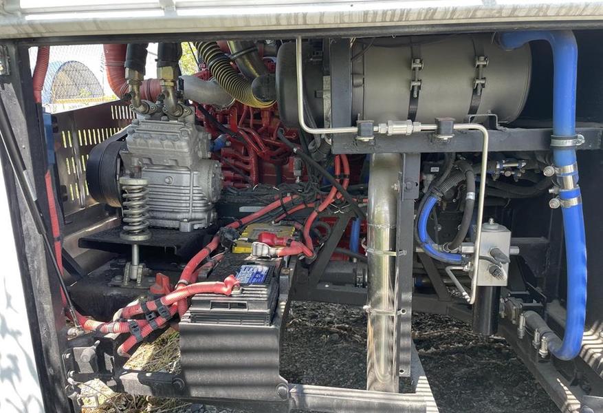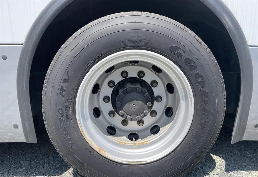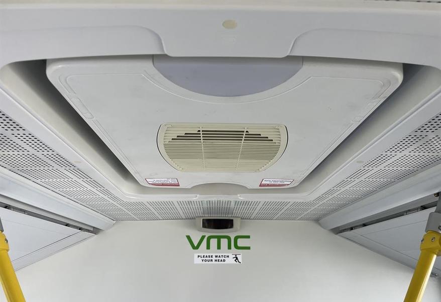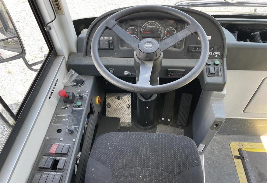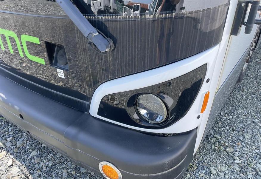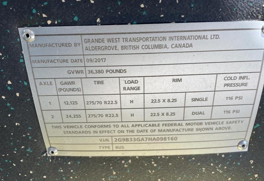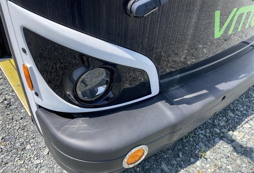 2017 Vicinity Motor Corp Grande West Vicinity 30-Passenger Transit Bus, powered by a Cummins compressed natural gas engine paired with an automatic transmission. Features air suspension, engine brake rated at 220 HP, front axle rated for 12,125 lbs and rear axle rated for 18,078 lbs. Measures approximately 30 feet in length. Equipped with wheelchair ramp access for improved accessibility. White and black exterior. Ideal for urban transit, shuttle services, or municipal fleet use. Formerly produced by VMC, a Canadian manufacturer headquartered in British Columbia.
