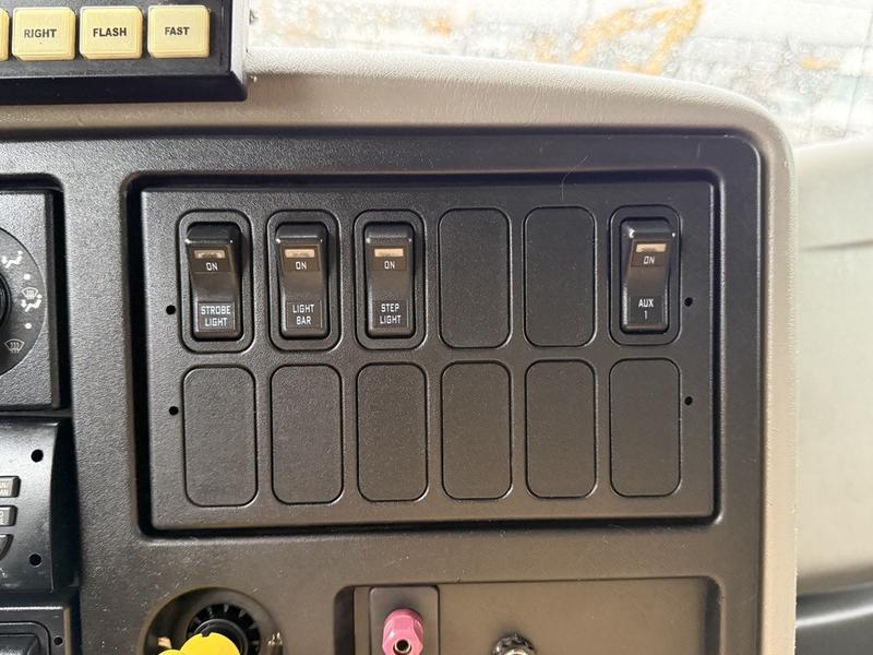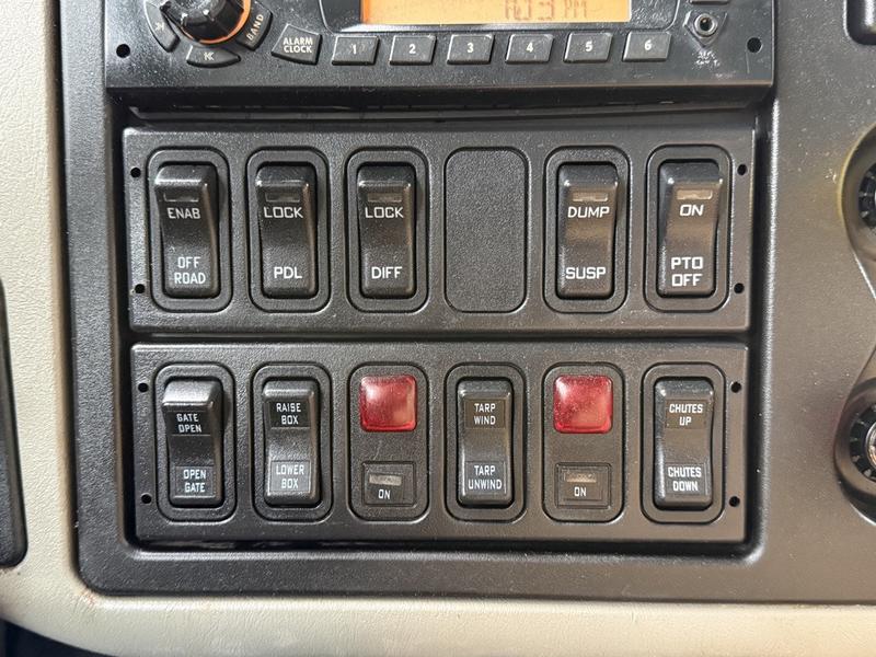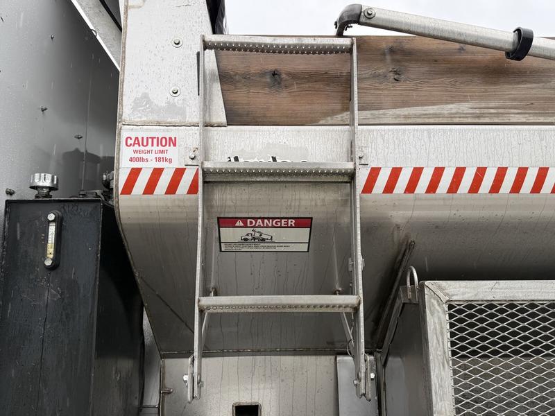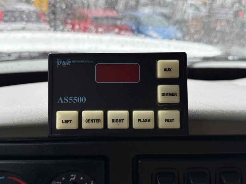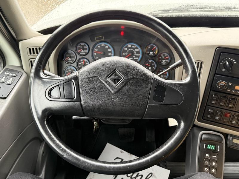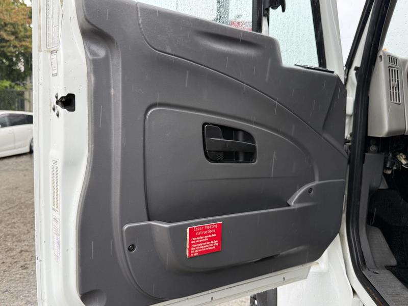 2011 International 7500 tandem axle dump truck with Twister T100 sander, powered by a 9.3L diesel engine and equipped with an automatic Allison transmission. Features PTO, differential lock, trailer air supply, air suspension dump, tarp control, and multiple lighting switches including strobe, light bar, step, and rear arrow signal lights. Includes foldable side ladder for dump access, tool box compartments (1000 lb max load), interior Espar heating valves, and air brakes. The 12-foot dump box measures 7’8” wide and 4’ high. White exterior over grey cloth interior with cruise control, AM/FM radio, power windows, locks, and mirrors. GVWR 54,000 lbs. Suitable for winter or year-round municipal service.