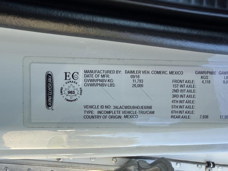 2017 Freightliner M2 106 reefer cube van powered by a Cummins 6.7L diesel engine and automatic transmission. Features include an 18-foot insulated cargo box, AM/FM radio, CD player, and a white exterior with black interior. Inside box dimensions: 18' long, 7'10" wide, and 7'9" high. Overall vehicle length is 28'8", width 8'5", and height 12'. GVWR rated at 11,793 kg (26,000 lbs). Ideal for temperature-sensitive deliveries or commercial fleet use.