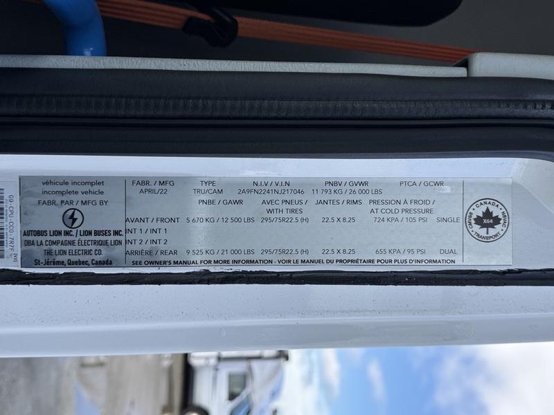 2022 Lion Lion6 electric cab and chassis featuring air brakes and powered by BMW batteries. This fully electric commercial platform has only 3,494 km and is equipped with cruise control, Webasto heater, power group, and AM/FM/CD radio. The GVWR is rated at 11,793 kg (26,000 lb), with a 12,500 lb front axle and 21,000 lb rear axle. Frame length from cab to end measures 25 ft 10 in, with a 16 ft 4 in cab-to-axle distance.