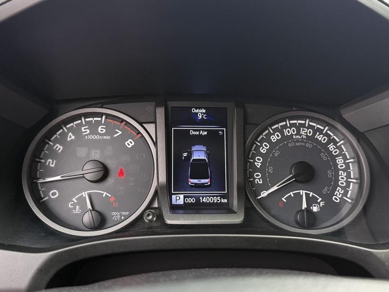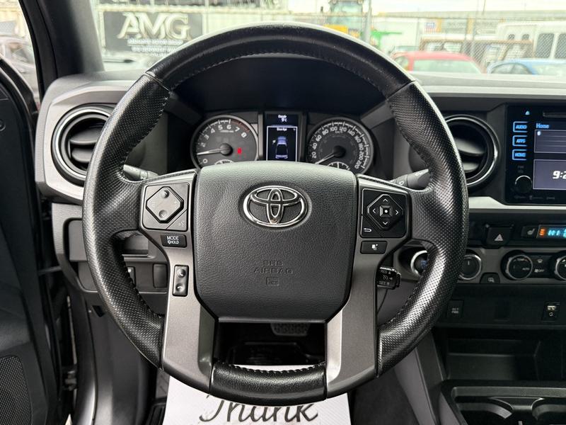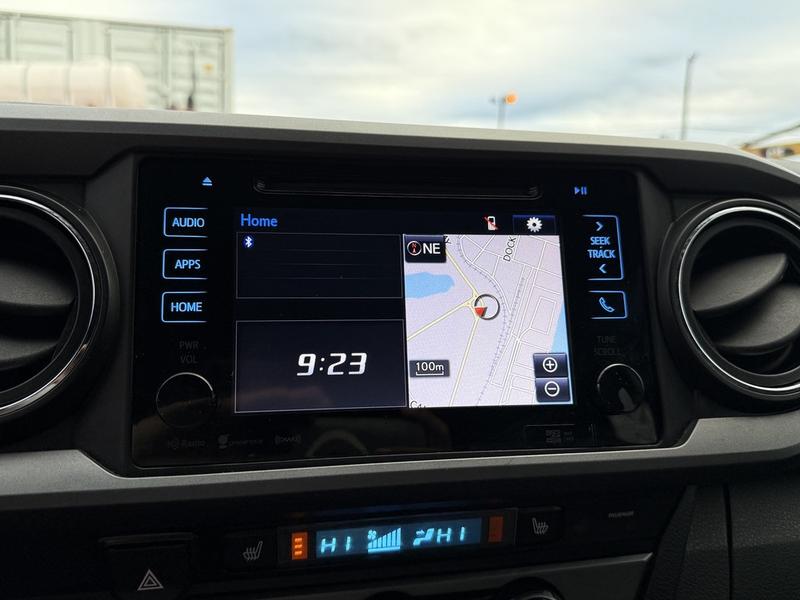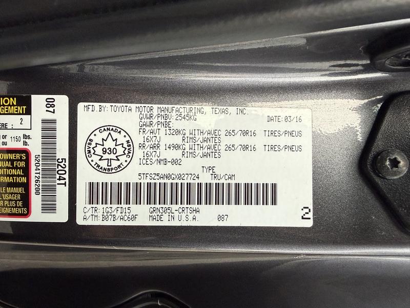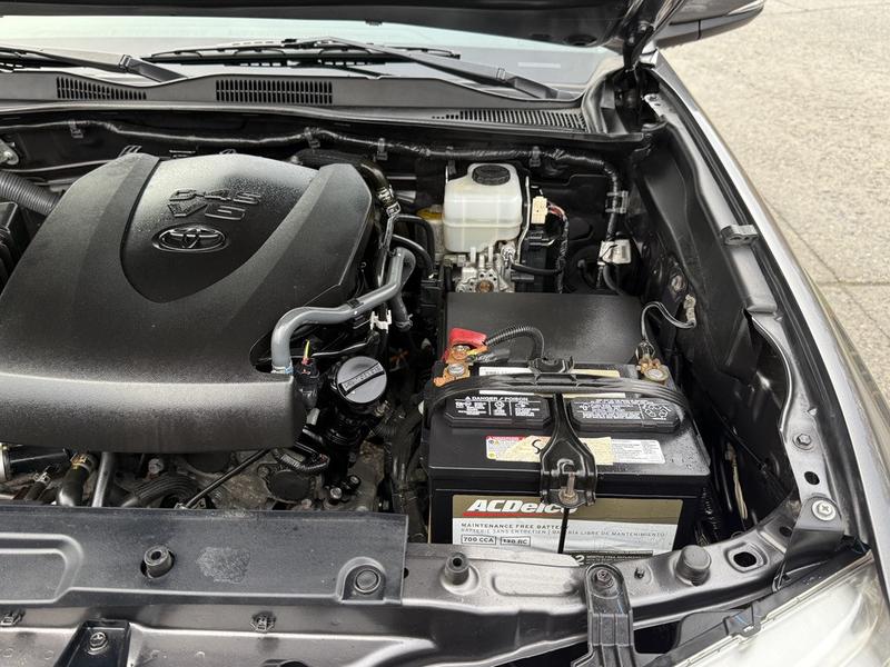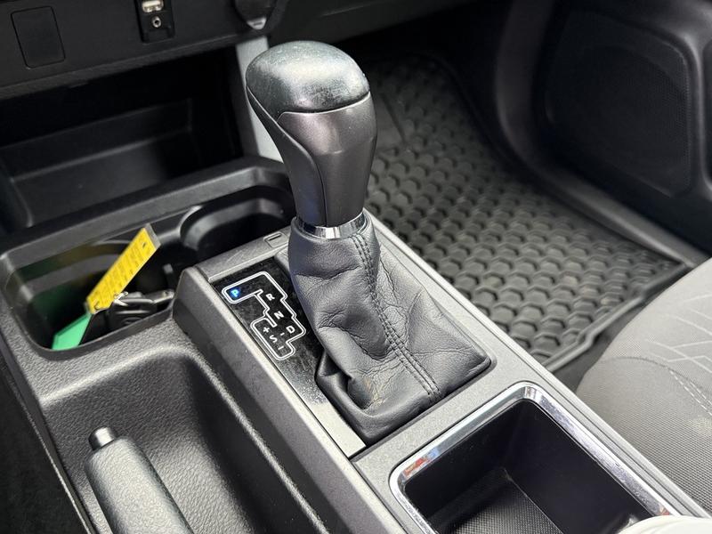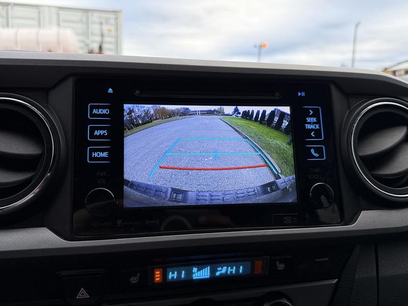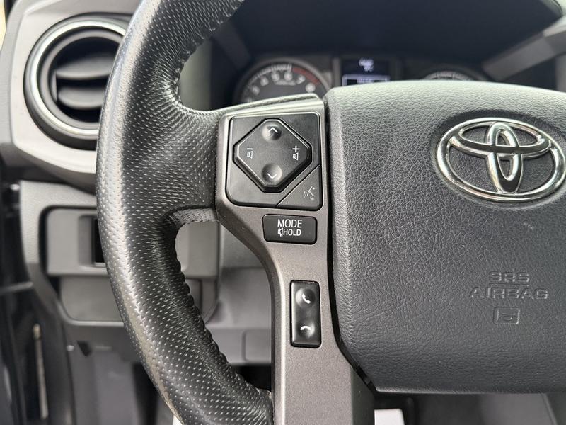 This 2016 Toyota Tacoma SR5 TRD Off Road 4x4 is equipped with a 3.5L 6-cylinder engine, automatic transmission and four-wheel drive, and features a grey exterior with a grey cloth interior. It includes a rear work canopy, Bilstein shocks front and rear, differential lock, MTS mode, crawl mode, 4x4 gear selector, engine push start, reverse camera, heated mirrors, heated seats, dual climate control, cruise control, 12V and USB input, cup holders, and an AM/FM radio with Bluetooth, along with power windows, power door locks and power mirrors.