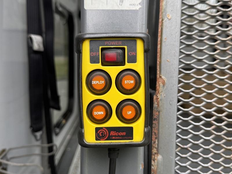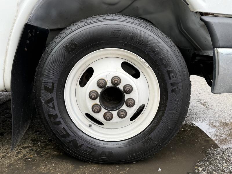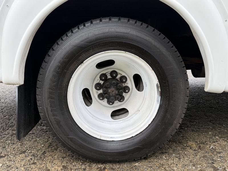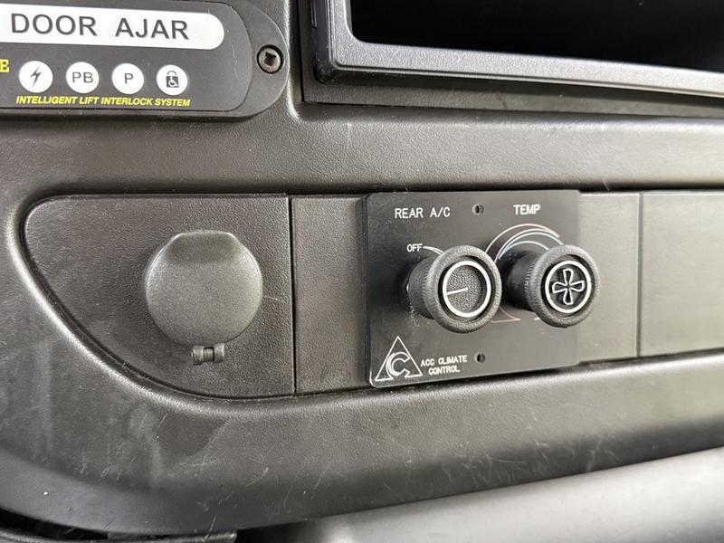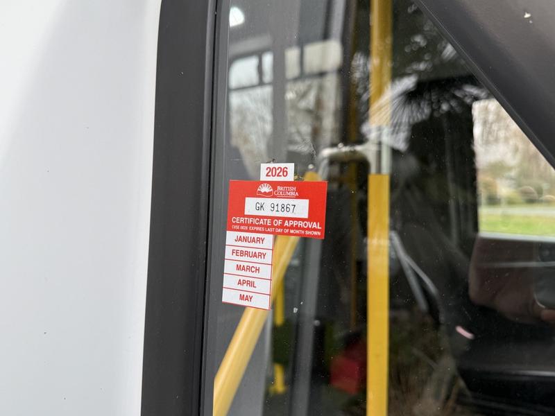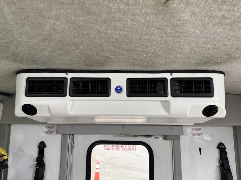 This 2015 Chevrolet Express 4500 11-passenger bus is equipped with a 6.0L 8-cylinder engine, automatic transmission and rear-wheel drive, and features a white exterior with a blue cloth interior. It includes seating for 11 including the driver, a Ricon wheelchair lift with an 800 lb (364 kg) capacity, front and rear air conditioning and heat, 12V input, cruise control and an emergency exit. The bus measures approximately 24 feet 11 inches long, 8 feet 2 inches wide and 9 feet 8 inches high, with a GVWR of 6,441 kg (14,200 lb).