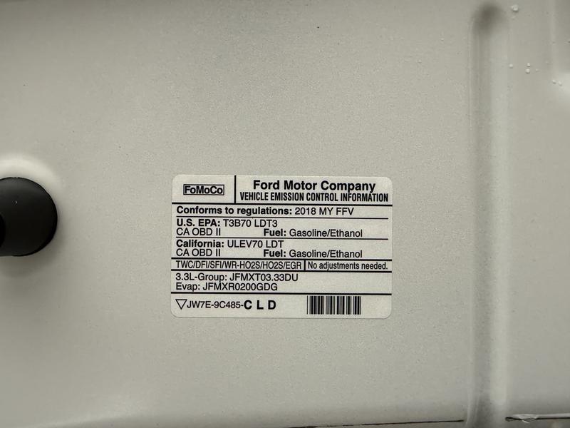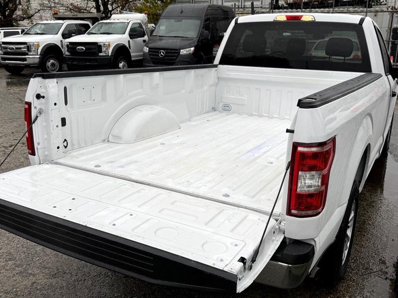 This 2018 Ford F-150 XLT Regular Cab 2WD is equipped with a 3.3L 6-cylinder engine, automatic transmission and rear-wheel drive, and features a white exterior with a grey cloth interior. It includes an 8-foot bed measuring approximately 5 feet 5 inches wide, Bluetooth and AM/FM radio, 12V and USB inputs, cruise control, air conditioning and heat, and power windows, power door locks and power mirrors. The truck measures about 18 feet 11 inches long, 6 feet 7 inches wide and 6 feet 3 inches high.