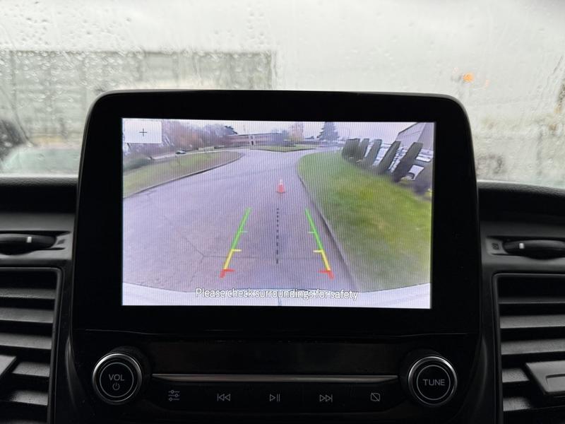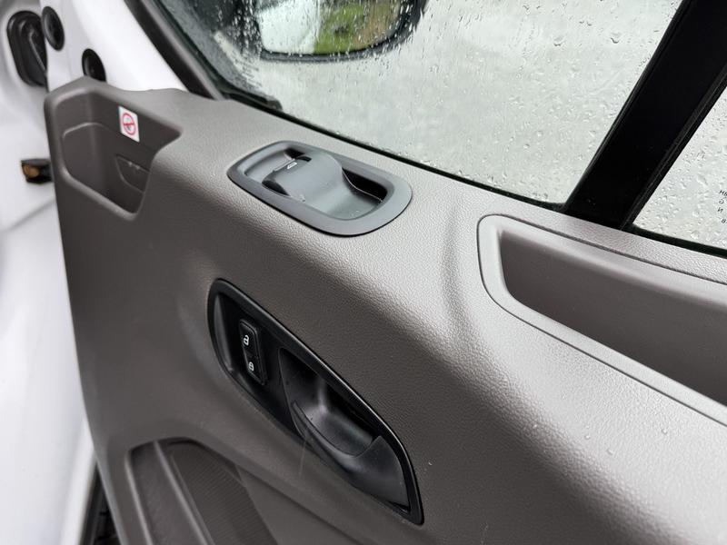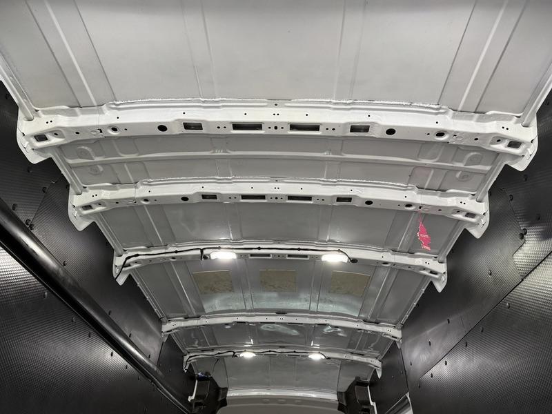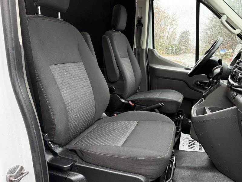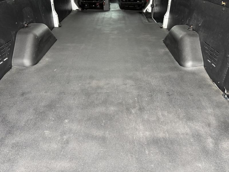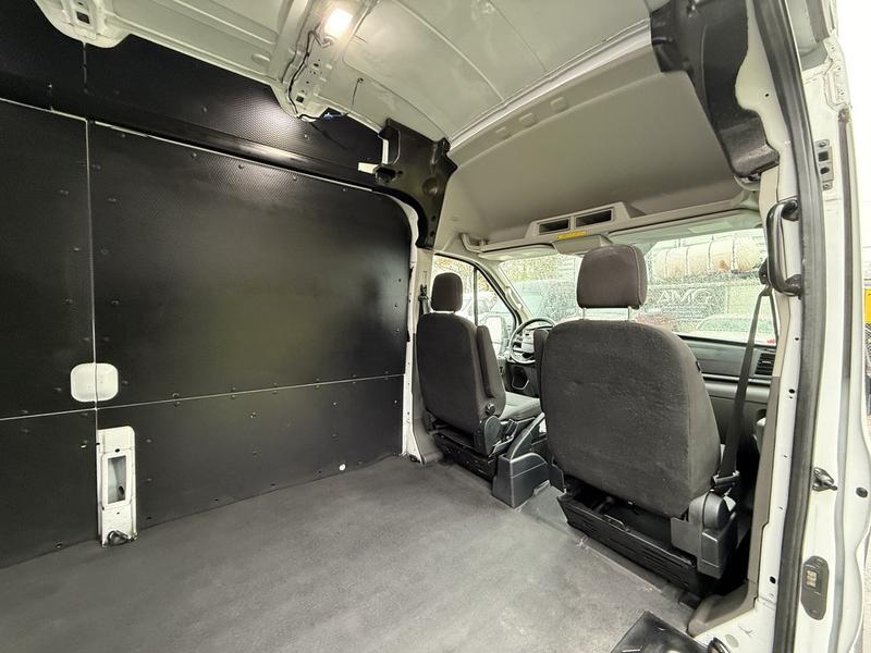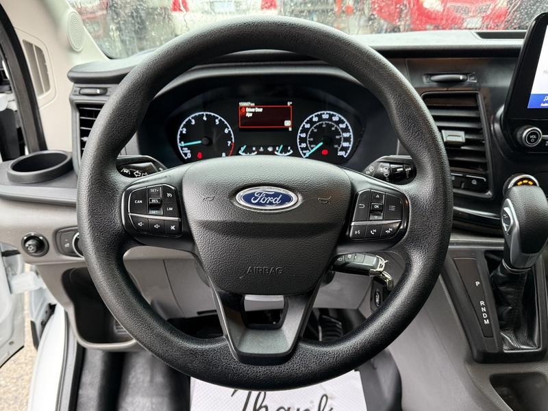 This 2020 Ford Transit 350 high roof extended length cargo van is equipped with a 3.5L 6-cylinder engine, automatic transmission and rear-wheel drive, and features a white exterior with a black cloth interior. Equipment includes a reverse camera, lane assist, cruise control, 12V input, cup holder, air conditioning and heat, and an AM/FM radio, along with power windows, power door locks and power mirrors. The van measures approximately 19 feet 6 inches long, 6 feet 7 inches wide and 9 feet 1 inch high.