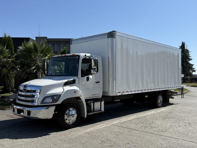 2020 Hino 268 24-Foot Diesel Cube Van with Power Tail Gate, 7.6L, 6 cylinder, 2 door, automatic, RWD, AM/FM radio, white exterior, grey interior, cloth. Box dimensions: 24 Foot Long, 8 Foot 2" Wide, 8 Foot 2" High.