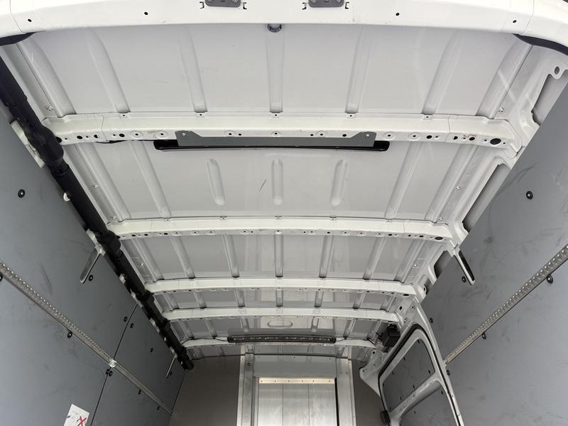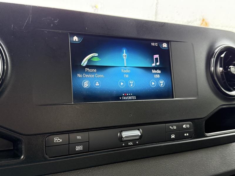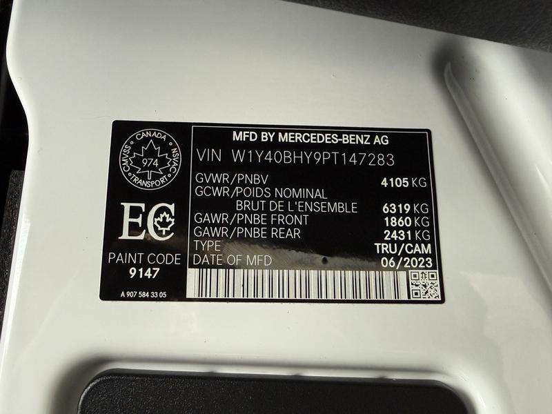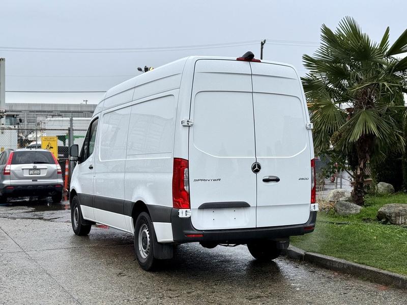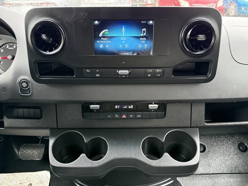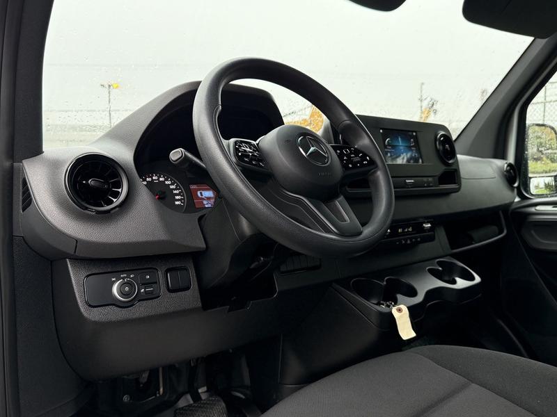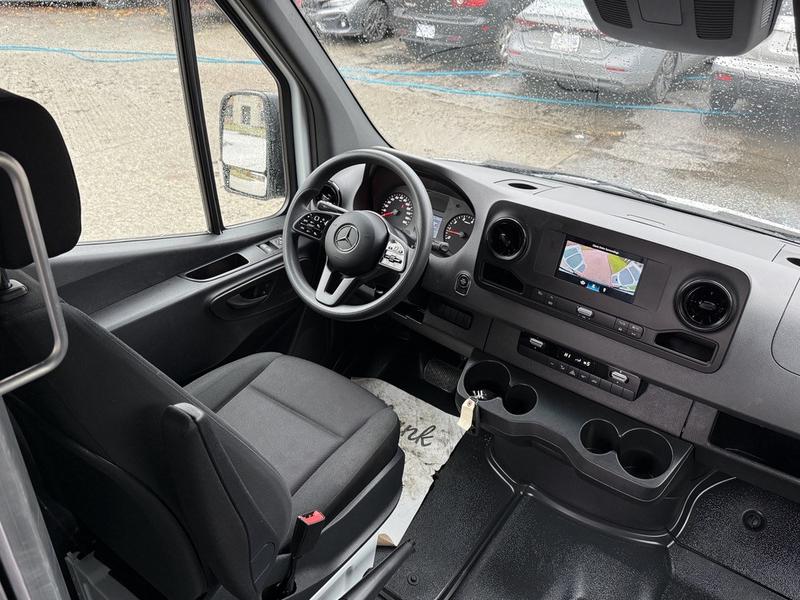 This 2023 Mercedes-Benz Sprinter 2500 high roof cargo van is equipped with a 2.0L 4-cylinder engine, automatic transmission and RWD driveline, and features a white exterior with a black cloth interior. Equipment includes cruise control, navigation, engine push start, back-up camera, air conditioning and heat, cargo lock, rear cargo lights, automatic door lights, power windows, power door locks, power mirrors and a manual-adjusting driver seat, along with an AM/FM radio. The van measures approximately 19 feet 6 inches long, 7 feet 8 inches wide and 8 feet 11 inches high.