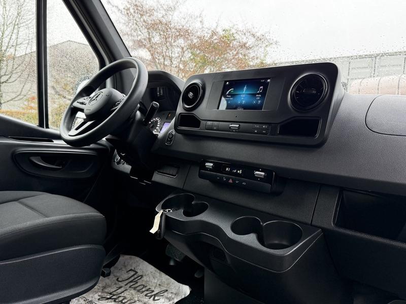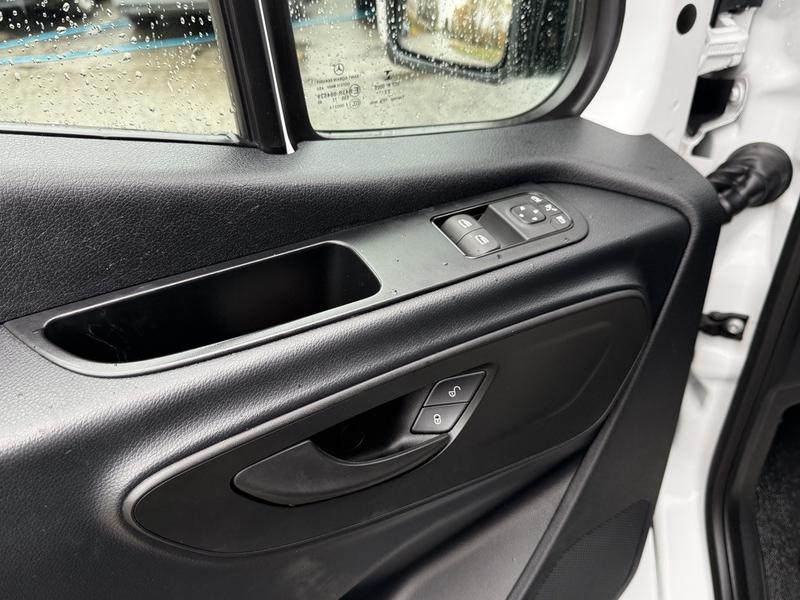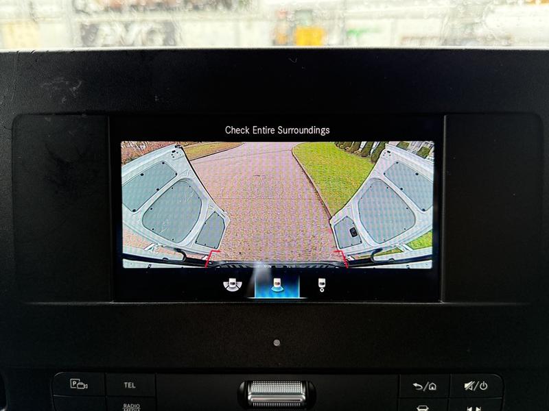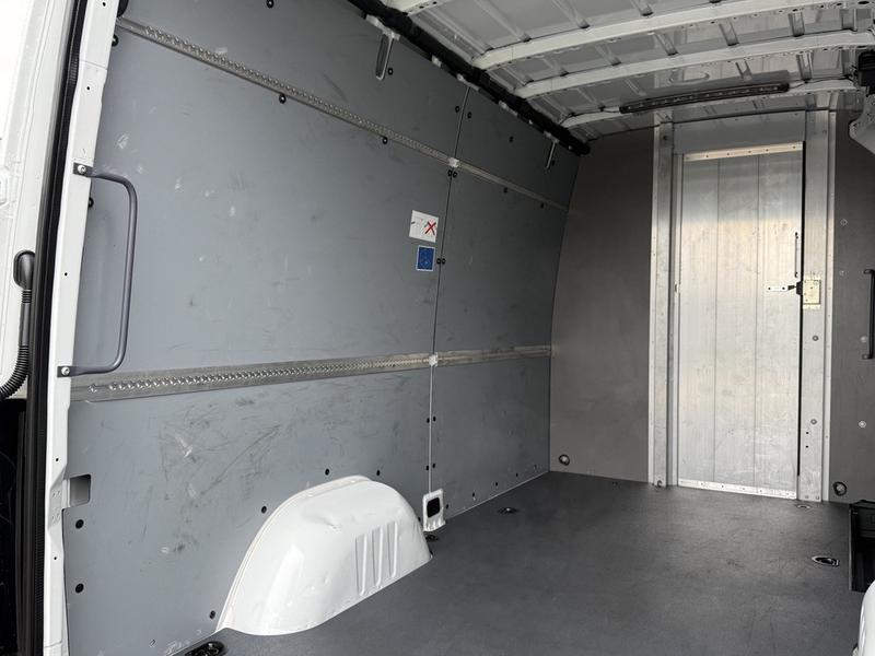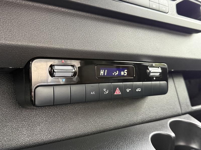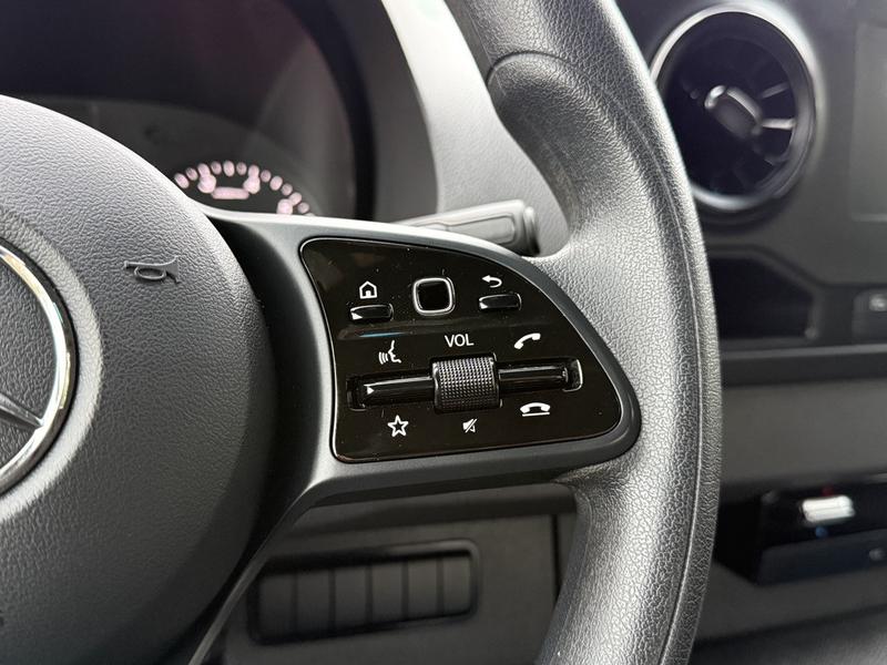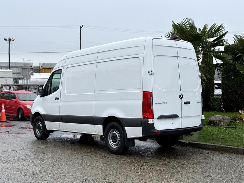This 2023 Mercedes-Benz Sprinter 2500 high roof cargo van is equipped with a 2.0L 4-cylinder engine, automatic transmission and RWD driveline, and features a white exterior with a black cloth interior. Equipment includes cruise control, navigation, engine push start, back-up camera, air conditioning and heat, cargo lock, rear cargo lights, automatic door lights, power windows, power door locks, power mirrors and a manual-adjusting driver seat, along with an AM/FM radio. The van measures approximately 19 feet 6 inches long, 7 feet 8 inches wide and 8 feet 11 inches high.
