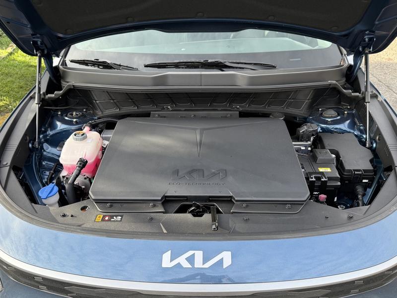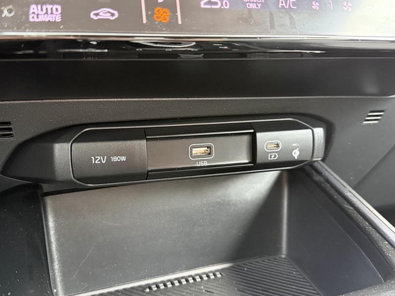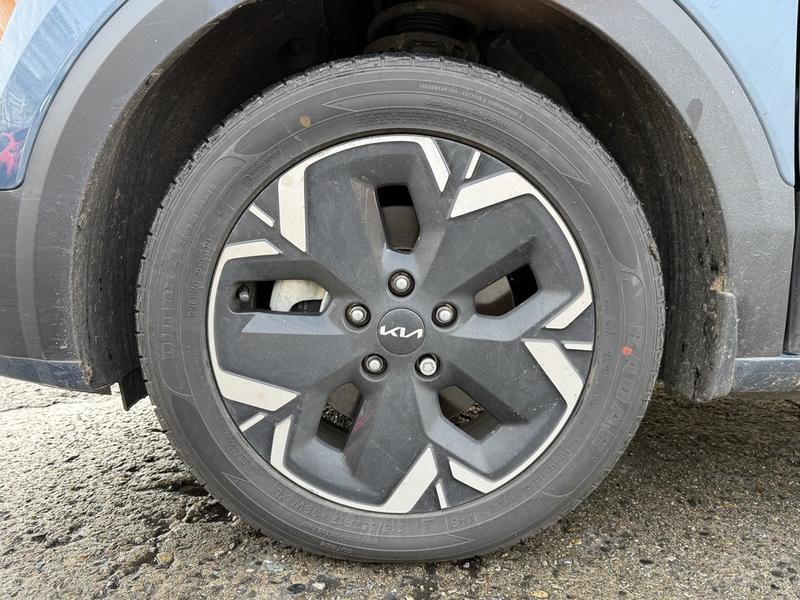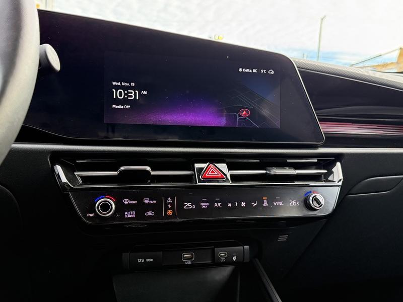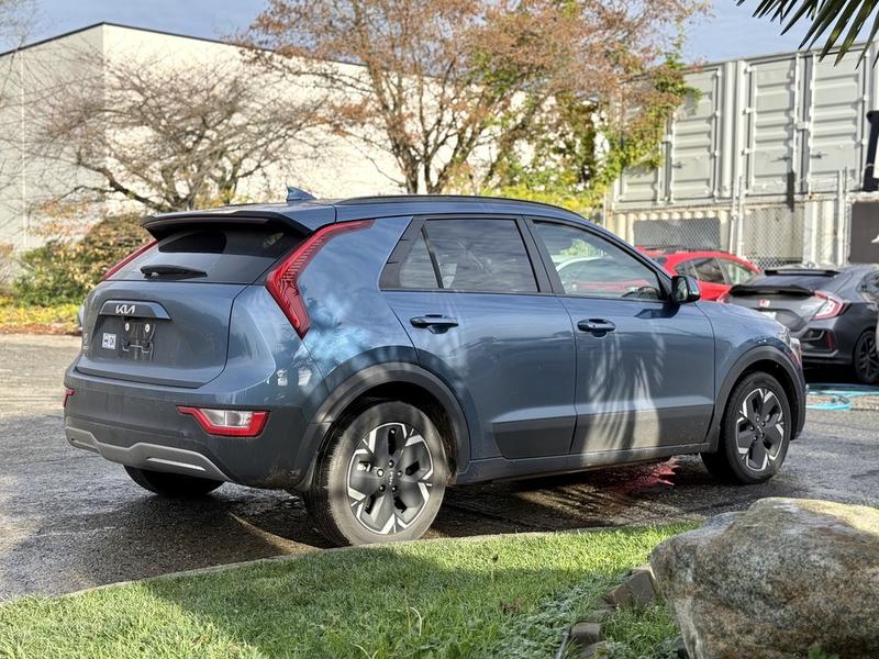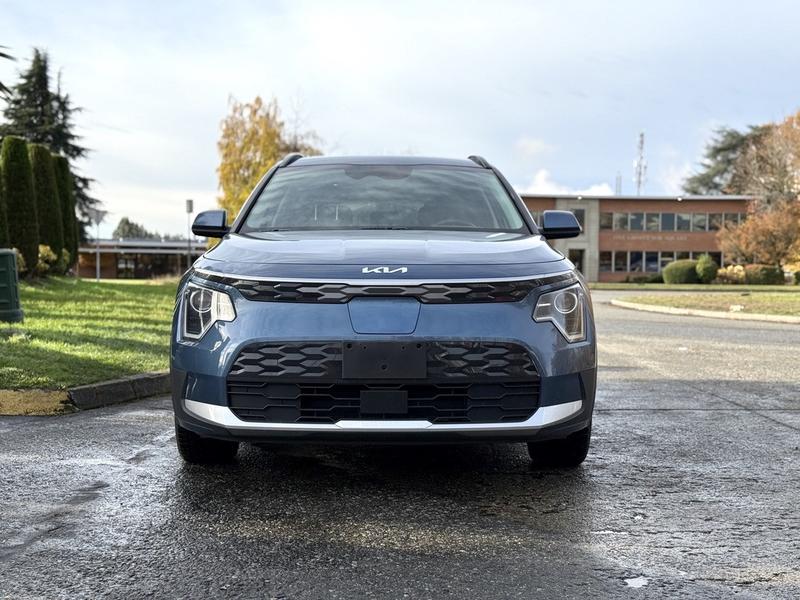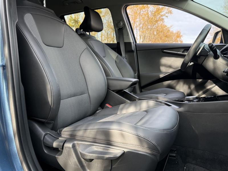 This 2023 Kia Niro EV Wind is equipped with an automatic transmission and front-wheel drive, and features a blue exterior with a black cloth interior. Equipment includes a touchscreen display, wireless phone charging pad, reverse camera, parking sensor, heated seats, heated steering wheel, dual climate zone, air conditioning and heat, 12V, USB and Type-C inputs, cruise control, brake hold, regen braking, lane assist, self-steering, drive mode selection, front collision warning and an emergency SOS function. The vehicle also has power seats, power windows, power door locks, power mirrors and a power trunk, along with an AM/FM radio.