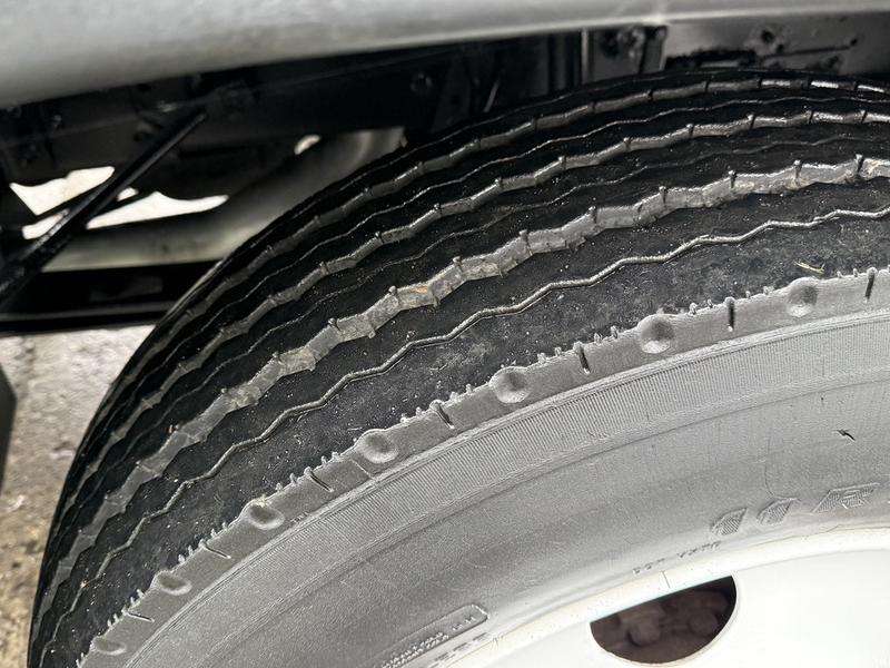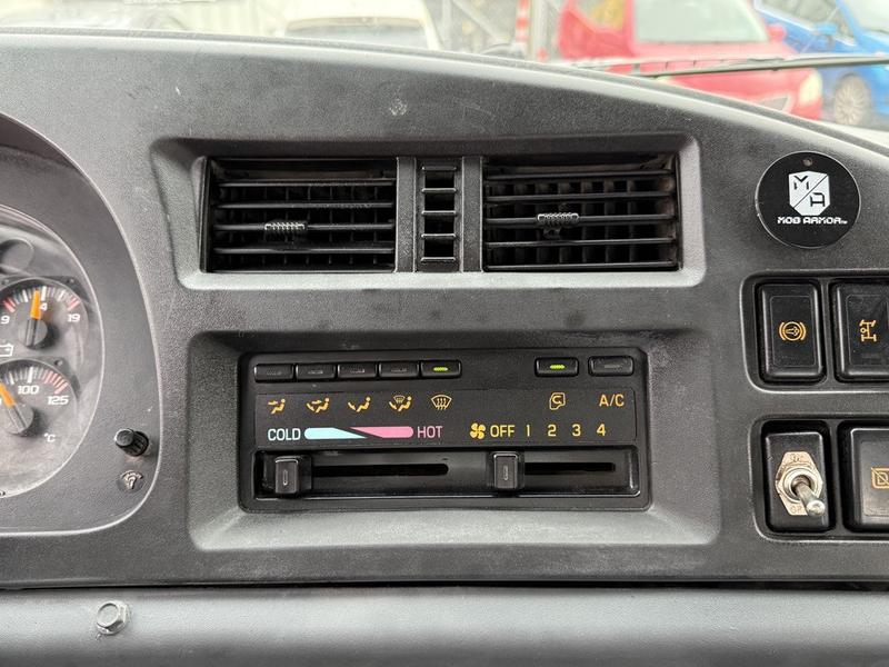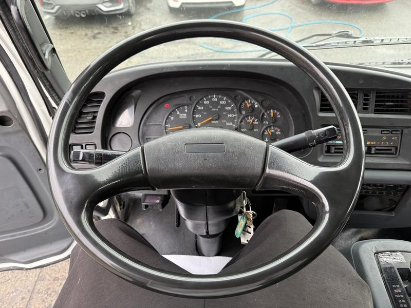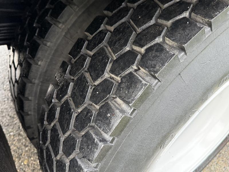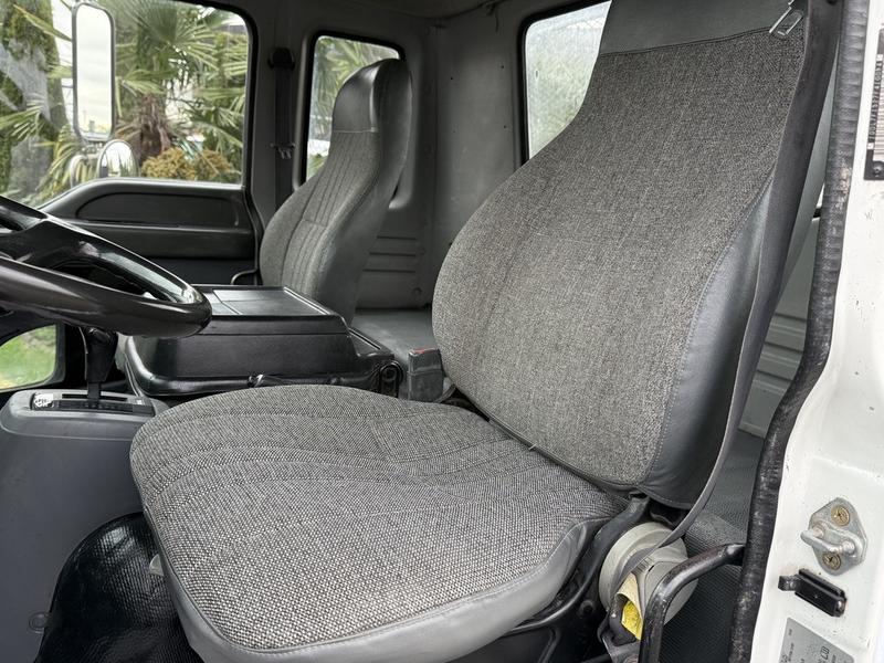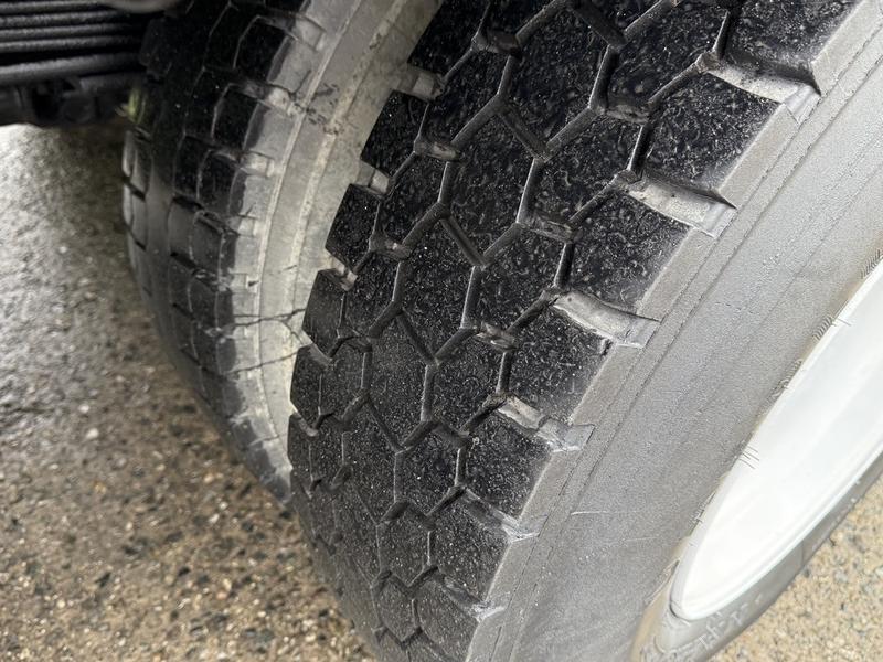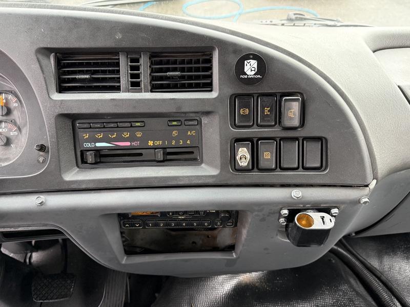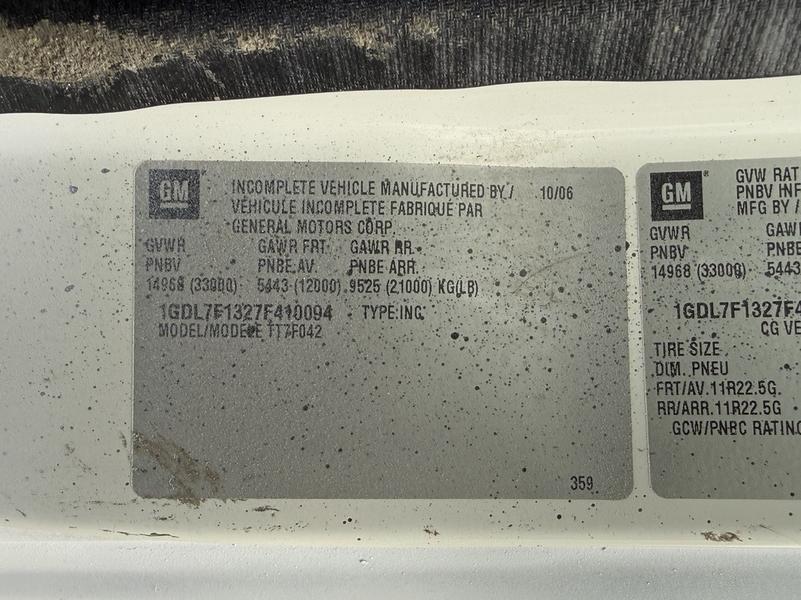 This 2007 GMC F7500 flat deck truck is equipped with a 7.8L 6-cylinder diesel engine, automatic transmission and RWD driveline, and features a white exterior with a grey cloth interior. Equipment includes hydraulic brakes, differential center lock, regen switch, heated mirrors, air conditioning and heat, AM/FM radio, storage compartments and a water hose. The flat deck measures approximately 24 feet long and 8 feet 6 inches wide. Overall vehicle dimensions are about 32 feet 2 inches long, 9 feet wide and 8 feet 11 inches high, with a GVWR of 14,968 kg (33,000 lb).