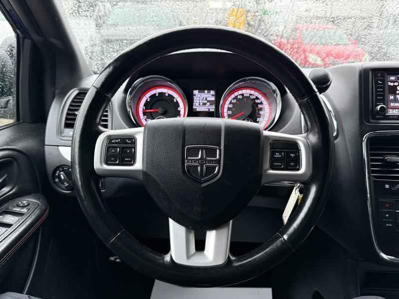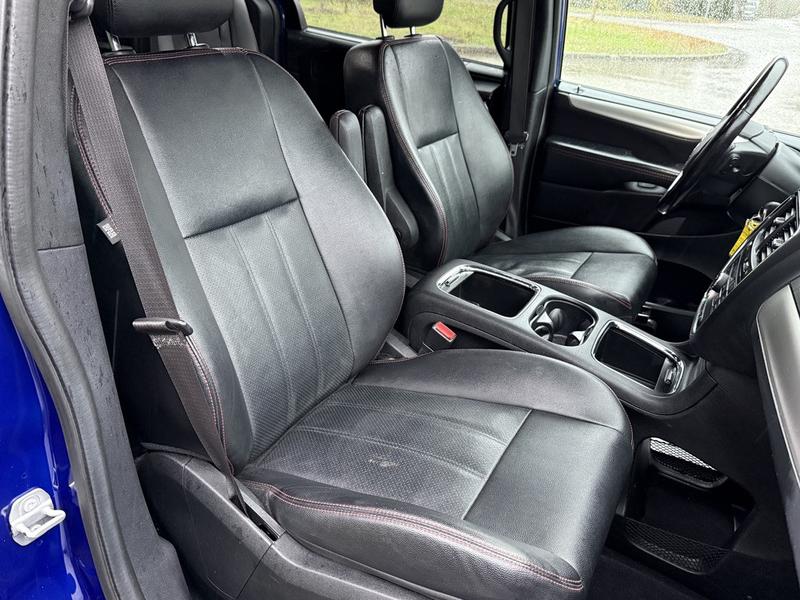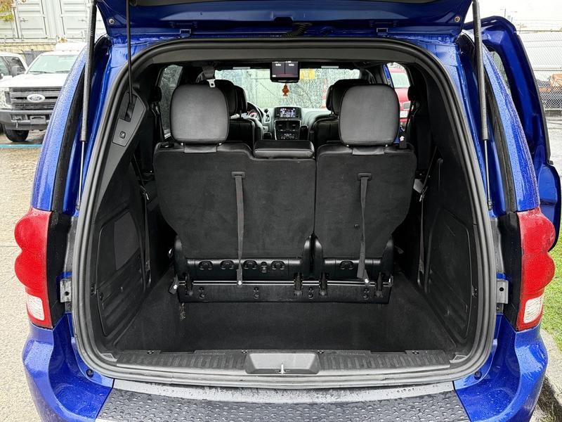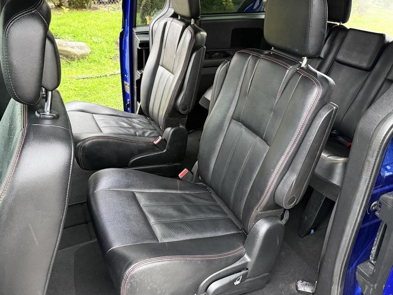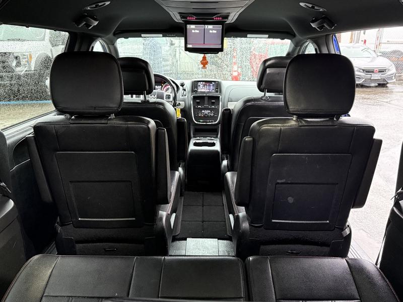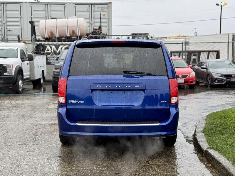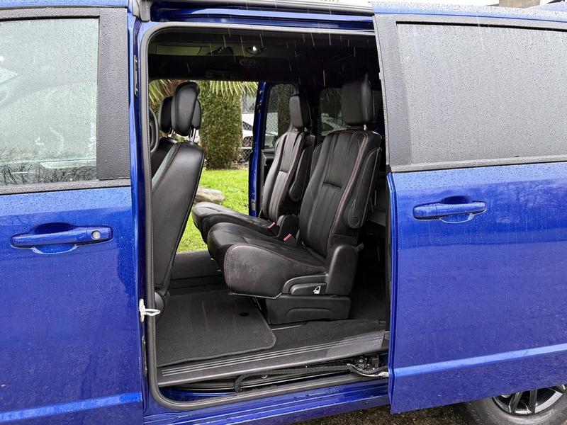 This 2020 Dodge Grand Caravan GT 7-passenger minivan is equipped with a 3.6L 6-cylinder engine, automatic transmission and front-wheel drive, and features a dark blue exterior with a black leather interior. Equipment includes auto-opening passenger sliding doors, rear DVD movie player, heated steering wheel, heated seats, reverse camera, front and rear air conditioning and heat, cruise control, Econ mode, cup holders, 12V input and an AM/FM radio, along with power windows, power door locks and power mirrors. The van measures approximately 16 feet 9 inches long, 6 feet 5 inches wide and 5 feet 6 inches high.