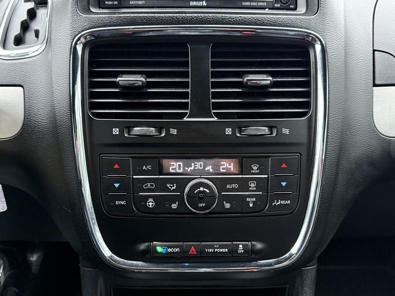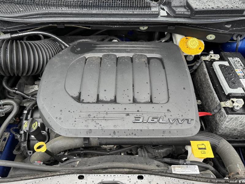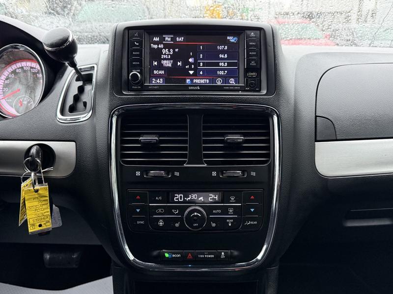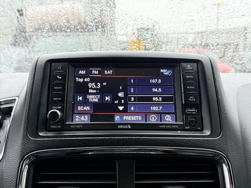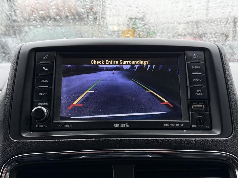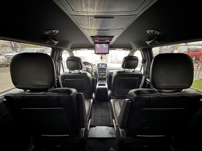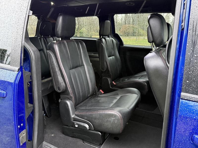 This 2020 Dodge Grand Caravan GT 7-passenger minivan is equipped with a 3.6L 6-cylinder engine, automatic transmission and front-wheel drive, and features a dark blue exterior with a black leather interior. Equipment includes auto-opening passenger sliding doors, rear DVD movie player, heated steering wheel, heated seats, reverse camera, front and rear air conditioning and heat, cruise control, Econ mode, cup holders, 12V input and an AM/FM radio, along with power windows, power door locks and power mirrors. The van measures approximately 16 feet 9 inches long, 6 feet 5 inches wide and 5 feet 6 inches high.